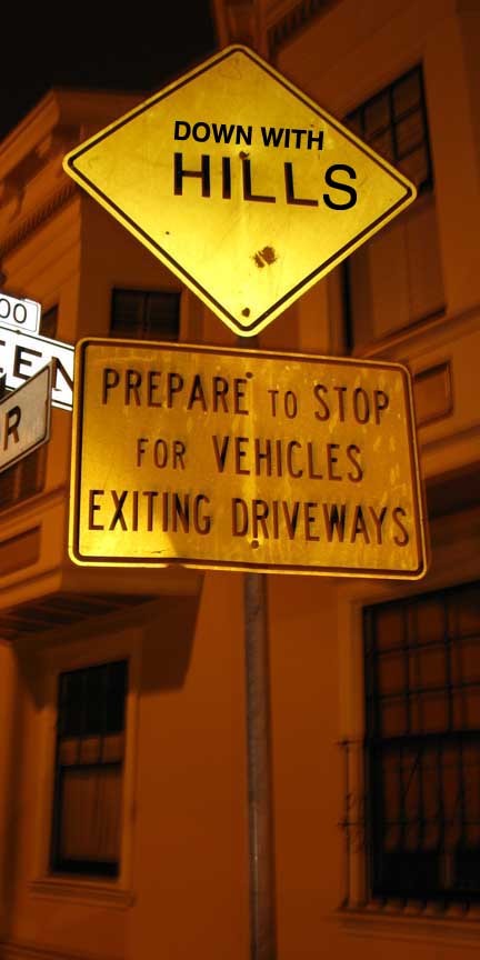 And having spent part of the day driving, the memory of those signs that say "HILL" at the tops of very steep sf hills are fresh in my mind. "How 'bout hills?" I say.