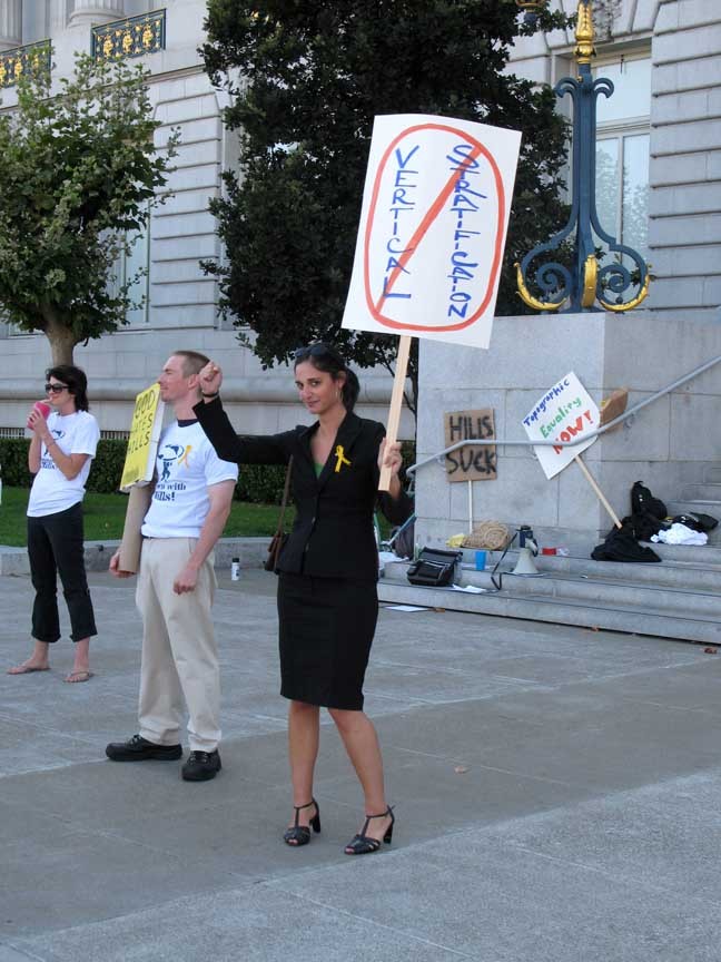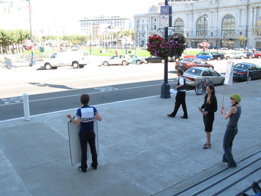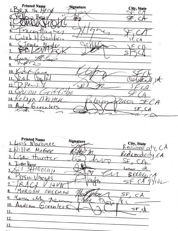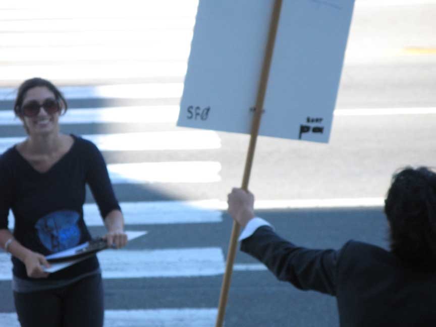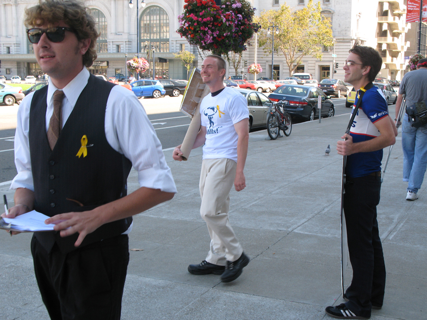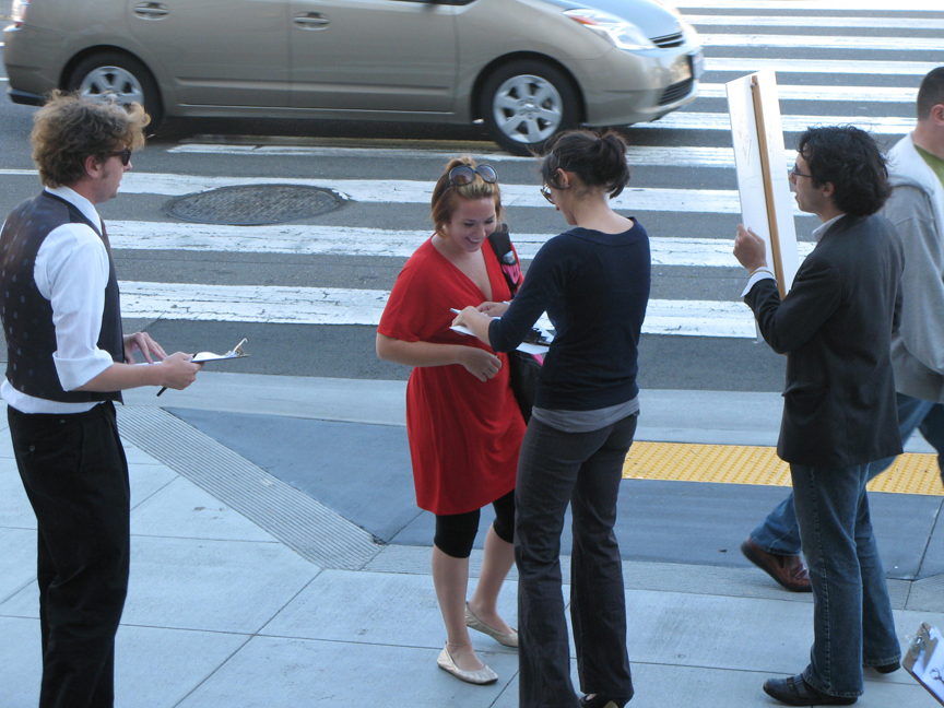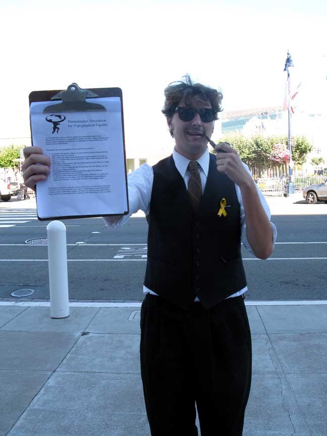 "Excuse me sir, do you support equality in San Francisco?" She did linguistic acrobatics, spouting phrases like "equal footing" and "vertical stratification" and "the overclass." Our first signature. The Downocrats ended up filling our lists with 26 signatures by the end of the day!