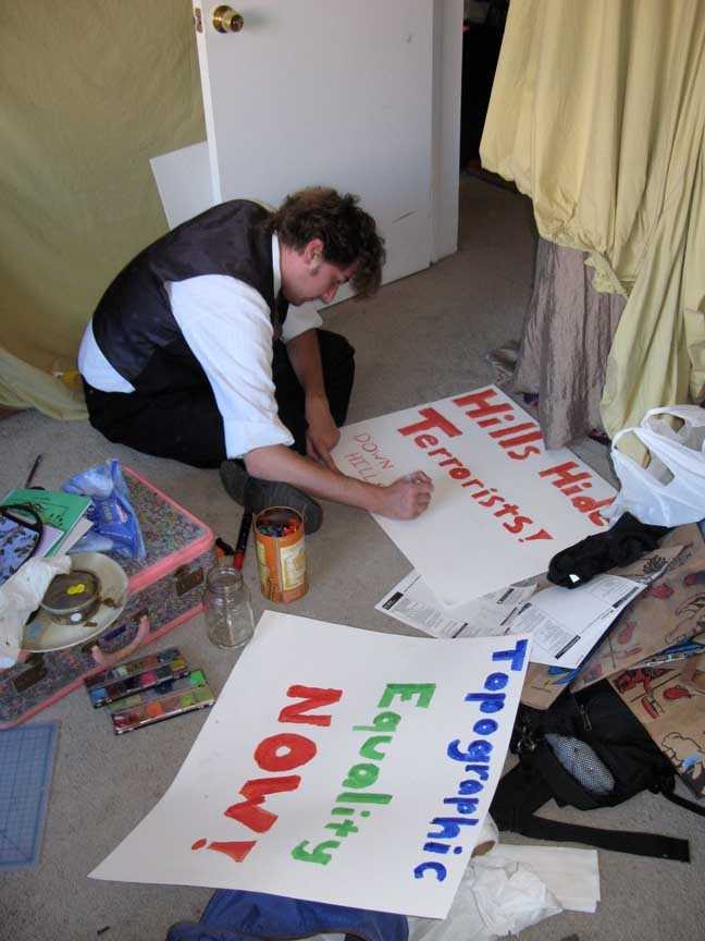 "Hills Hide Terrorists!" "Topographical Equality Now!" "Hills Kill Babies!"