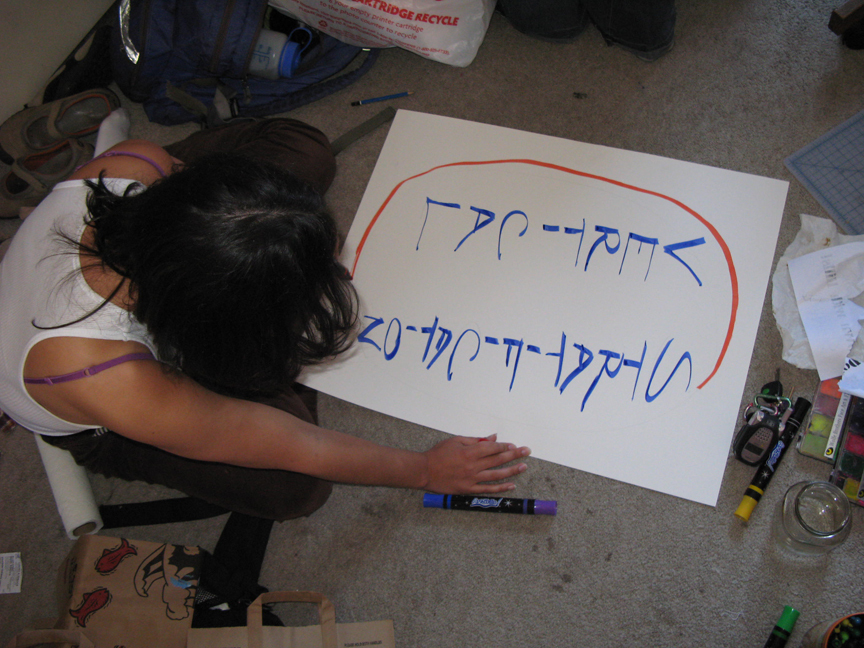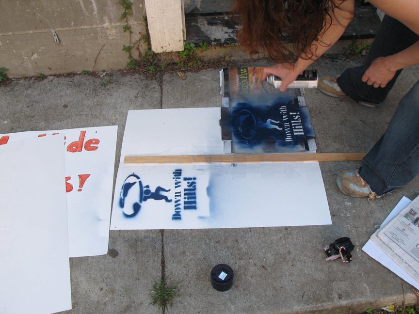 i brought a megaphone which turned out to be pretty useful. i also had materials with which to make a sign. a can of black spray paint, cardboard, tape and a piece of PVC leftover from a magnificent "failure". i yelled a lot and i very awkwardly solicited signatures from a couple bicyclists.