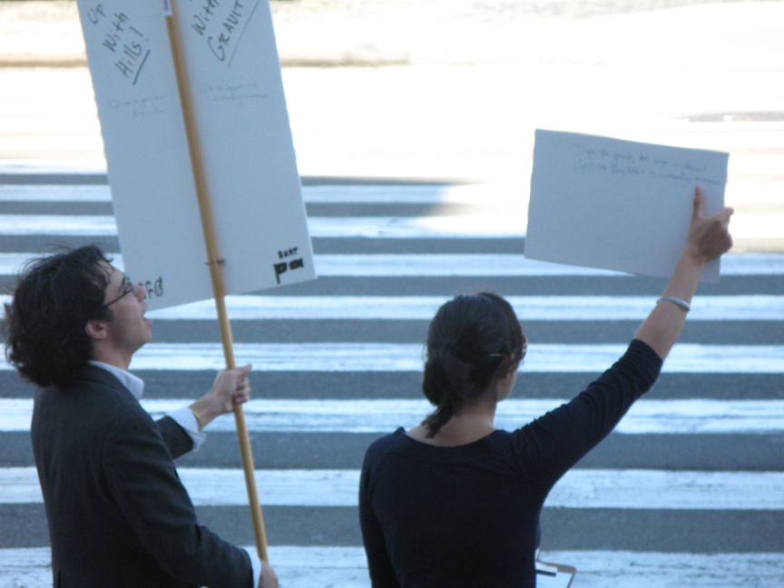 When we finally arrived, there was a moment of hesitation. We mulled on the steps, holding our signs and trying to get into character as a few passersby gave us raised eyebrows and looked away.