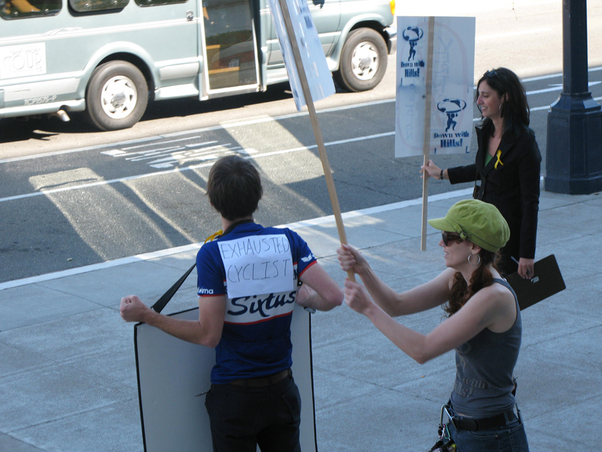 JTony:All I know is I look HAYOOGE in that white t-shirt. Anyway, I just saw the event, knew I liked everyone, and figured it'd be fun. I chose the pro-hill side long before I knew what tension there would be between the sides. I just have too many fond memories of looking down on the rest of the world, plus, what with my height and all, I feel at home on hills. I helped most, I think, by making some signs, one that said "The Hills are Alive" and the other that said, "Honk if You Love Hills". The last one got us a lot of honks. I didn't think I'd be so loud, as usually I'm pretty quiet and unassuming (well, for someone over 260lbs) but lending my voice to the effort helped counteract the megaphone a bit and helped make our small group mighty.