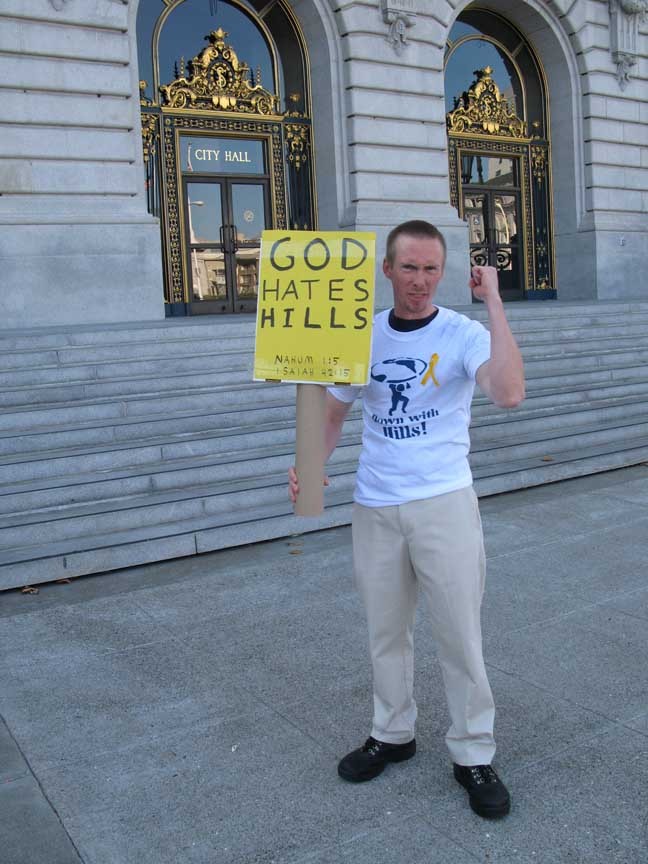 Loki here, with a religious perspective. As some of you may remember, when the topic of hills was first brought up, I was undecided. On one hand, I really like hills. I grew up in rural, mountainous terrain and have always love hiking and walking through high places. I love the vistas that San Francisco's hills offer. I even like the step sidewalks that thread this beautiful city. On the other hand, Bex, Lank and their cohorts make a convincing ethical case against hills. I'm all for social justice, and I'm also naturally wary of any position that defends the status quo.