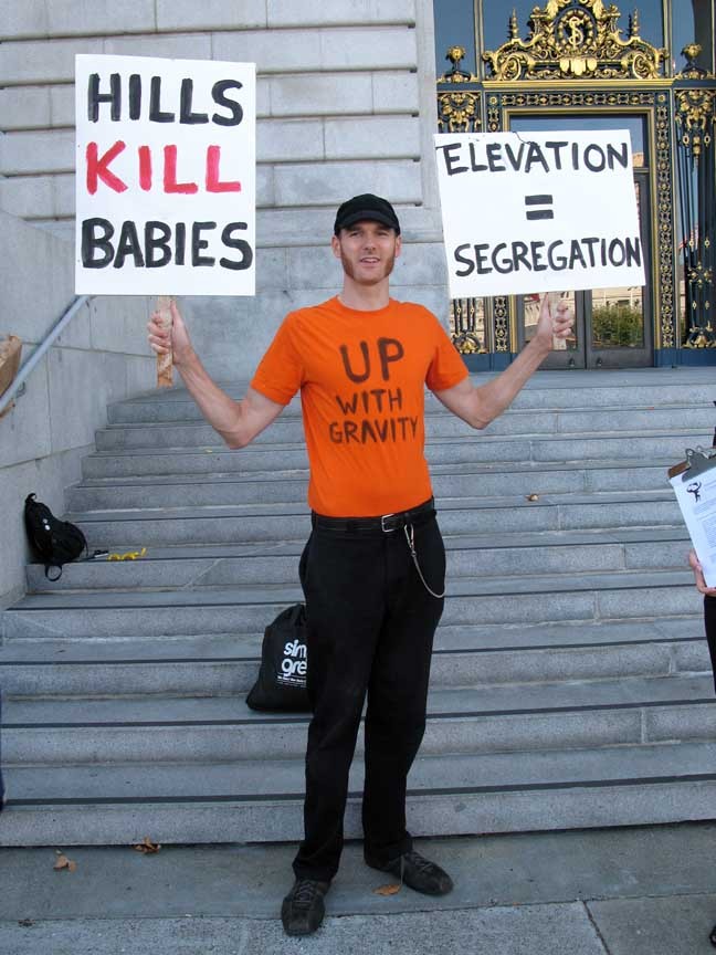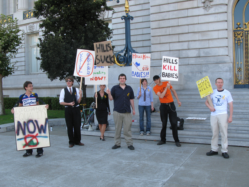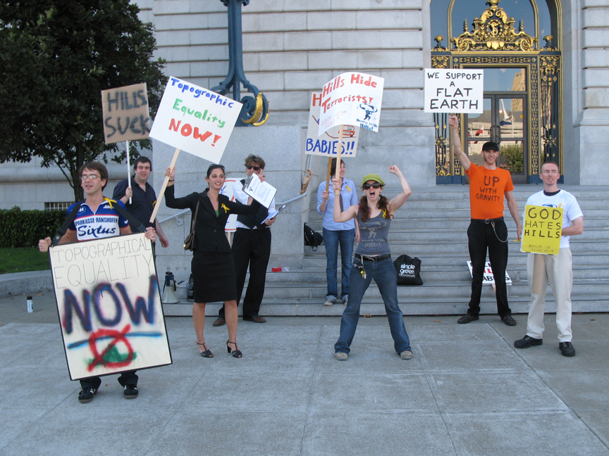 F That....San Francisco would still be just as amazing if it were shy a few hills....besides, less hills would encourage those who would normally be too pussy to ride a bike and would help our environment!! HILLS DESTROY THE ENVIRONMENT!!!
