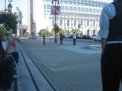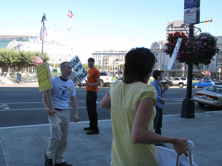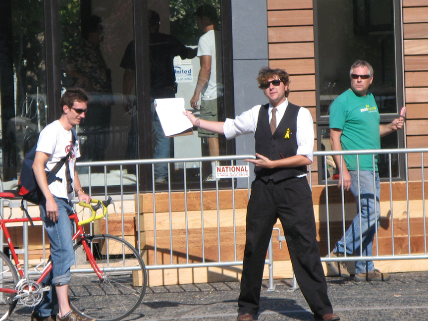 My, how I love an excuse to dress sharply, harrass strangers and act self-righteous! I don't have much to add to the descriptions above, except that for me the highlight was getting flashed by some girl in the back of a passing SUV. Down with hills, up with shirts!!