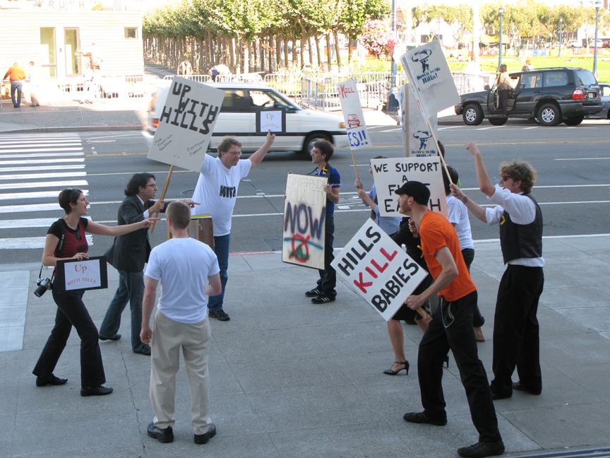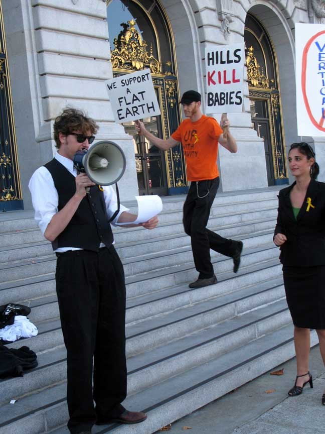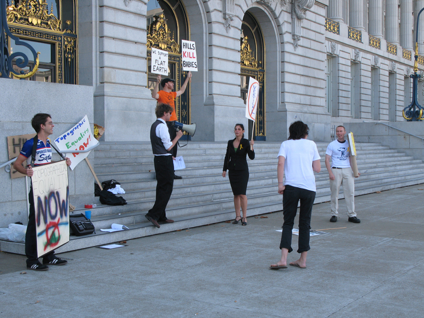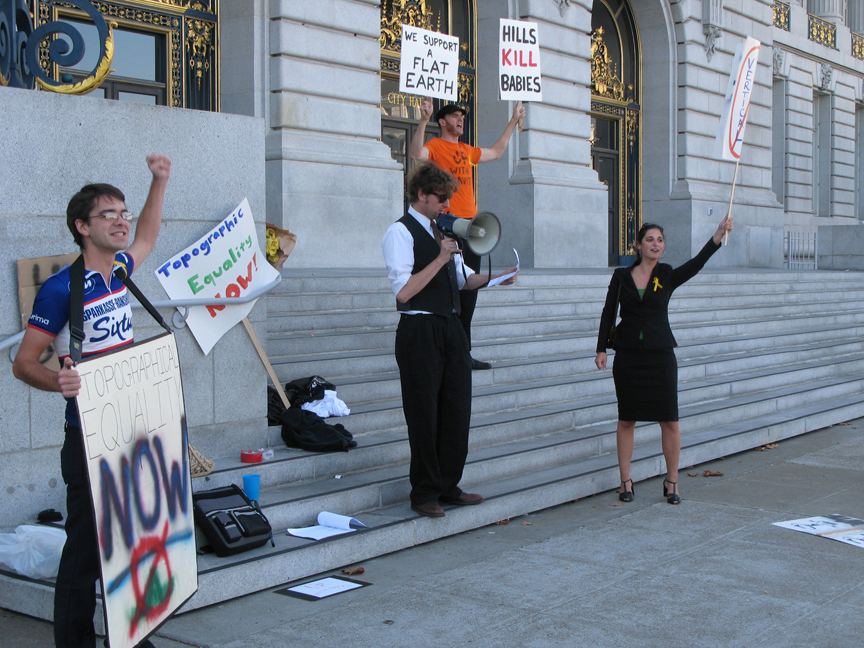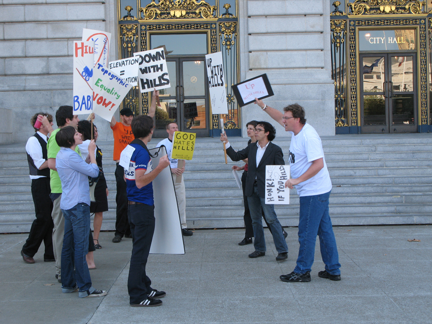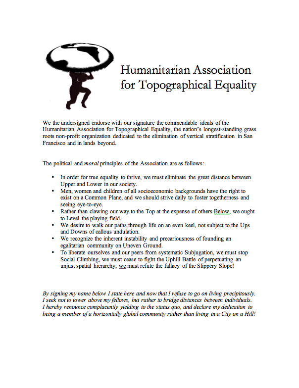 The HATE Manifesto:We the undersigned endorse with our signature the commendable ideals of the Humanitarian Association for Topographical Equality, the nation’s longest-standing grass roots non-profit organization dedicated to the elimination of vertical stratification in San Francisco and in lands beyond.