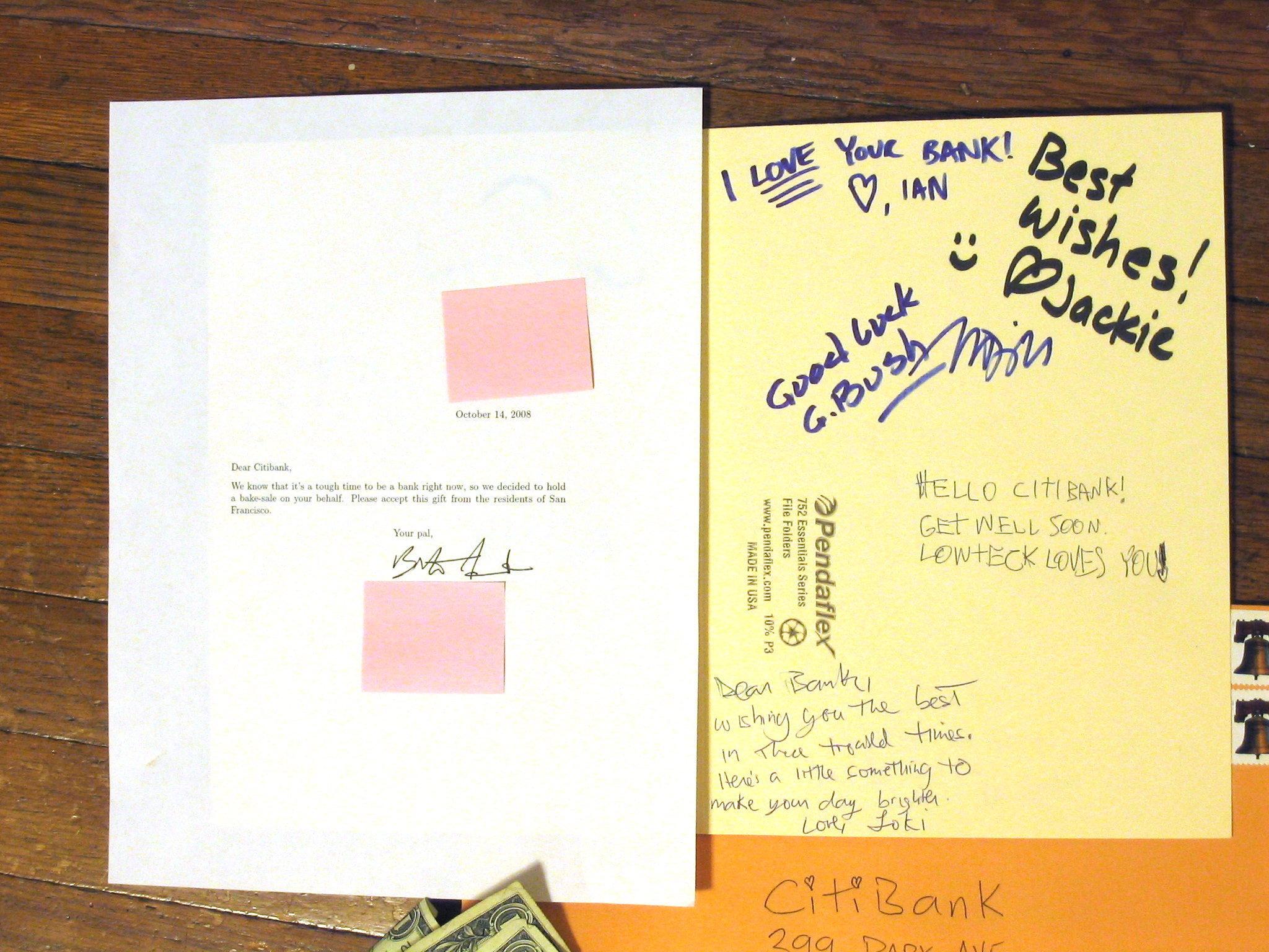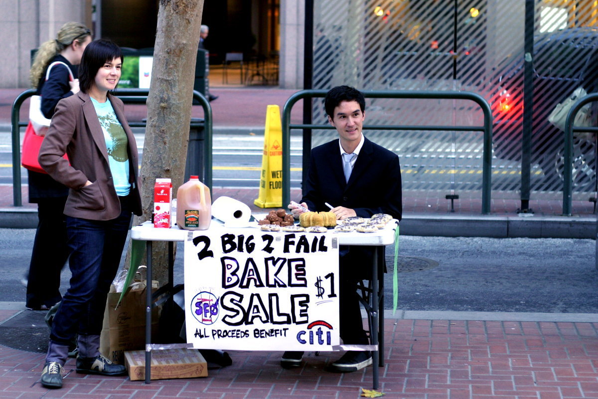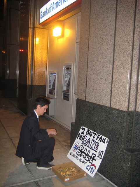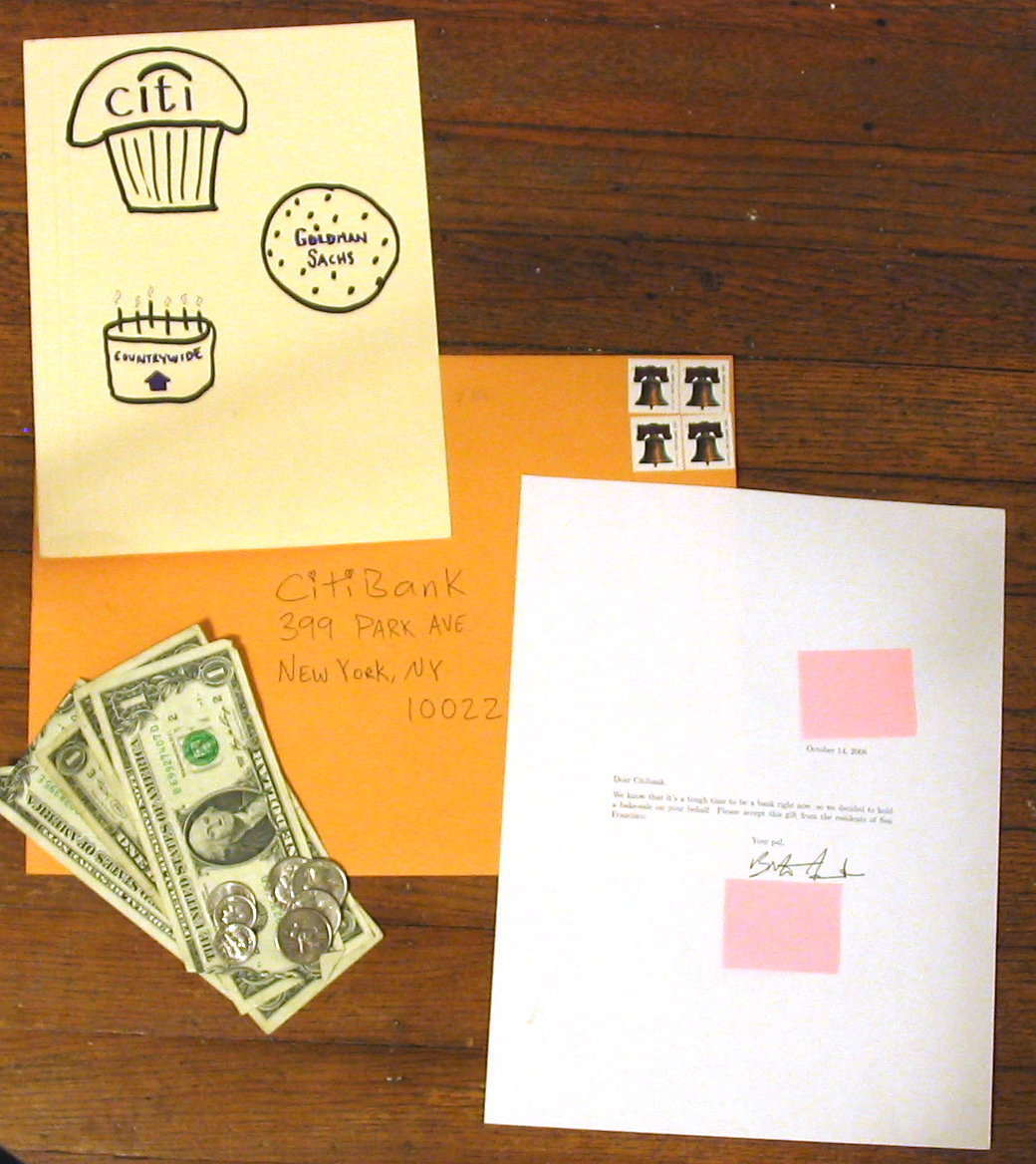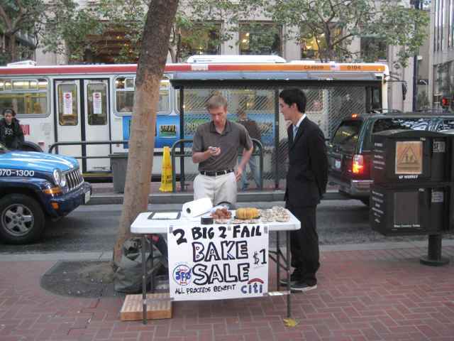 October 15th, 2008 9:29 AM / Location: 37.791222,-122.3990We chose to donate the proceeds of our bake sale to CitiGroup, a bank that we felt was too-big-to-fail, but also one reaching out for help, given its attempt to buy $300 billion in Wachovia's bad loans, $250 billion of which would have been backed by the government, not CitiGroup. This corporation seemed like it needed our aid.