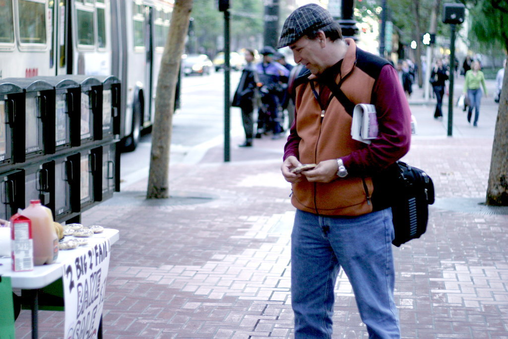 What happens if you walk into a donut shop at 1AM holding a camera and ask the man behind the counter for "anything that looks like it could have been home made?" He laughs at you, calls the baker from the back of the store to share in the joke, and offers to sell you the least pretty bran muffin in the shop.