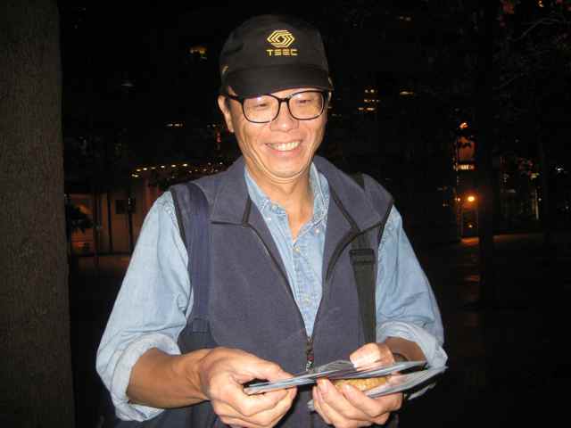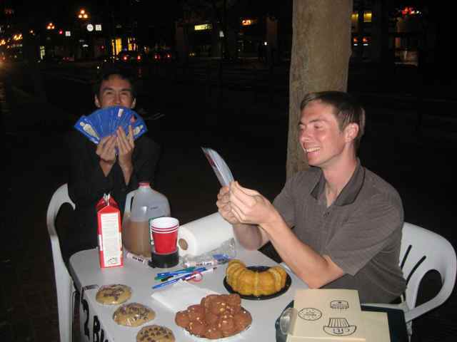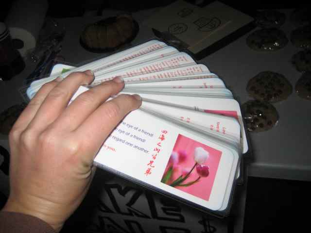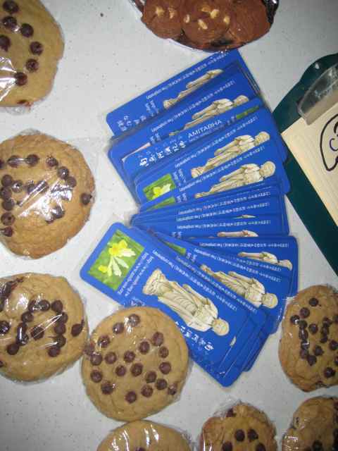 A lot of people walked by and seemed to enjoy the sign and sale, though some really didn't want to donate to CitiGroup. One lady tried desperately to nail down which school we were holding the bake sale for, and couldn't be convinced on the merits of donating to CitiGroup ("if it was for a school, I'd buy something"). Others were willing to sign the card but not to donate. Still, a few people found the cause worthy and bought baked goods. One man even approached us, offering lovely laminated bookmarks with "Buddhist" poems and translations of "Thank You" and "Love" on them. We wound up receiving not only around 30 bookmarks each, but he also bought a cookie! We noted his Buddhist inclinations for future target marketing.