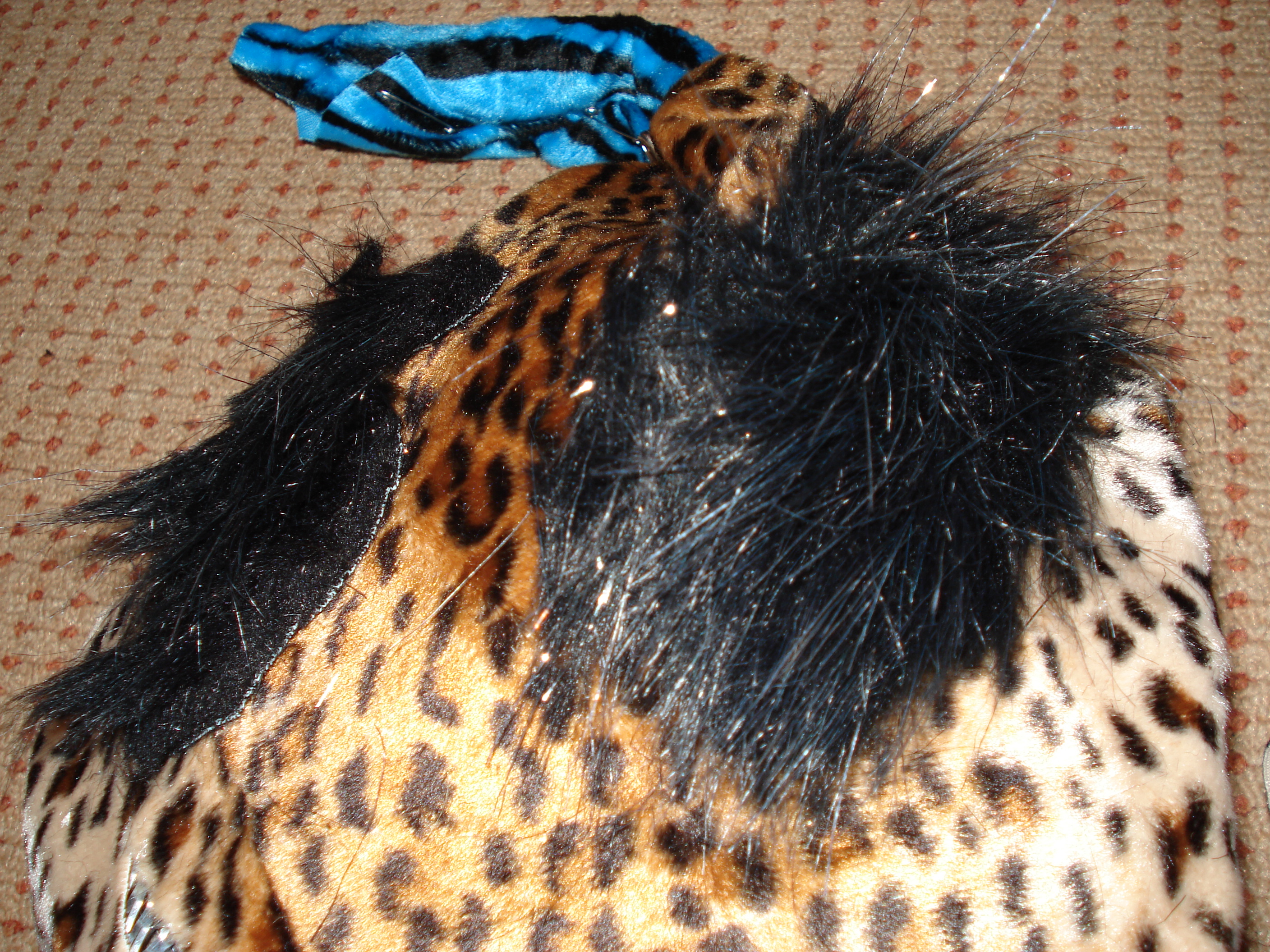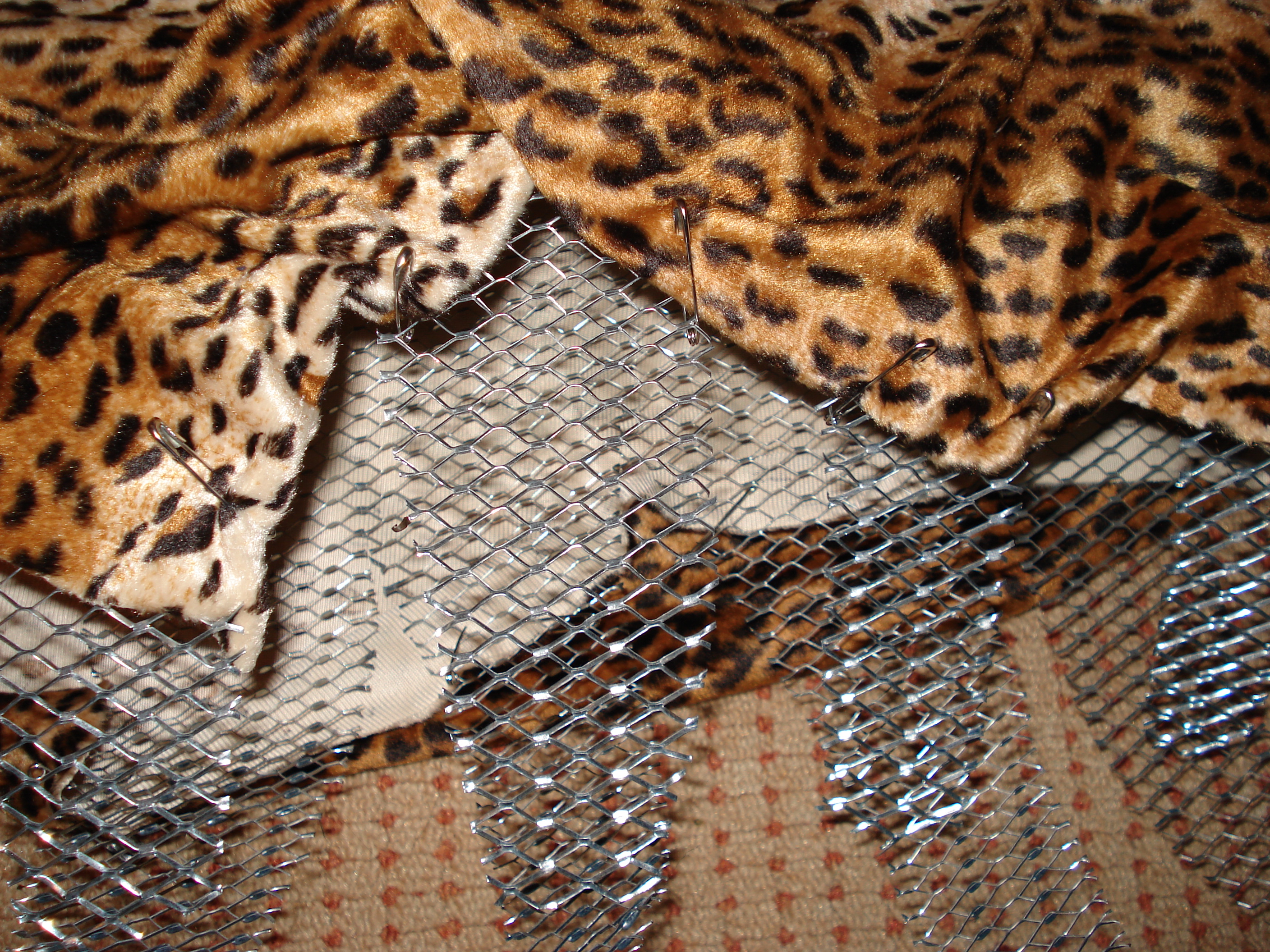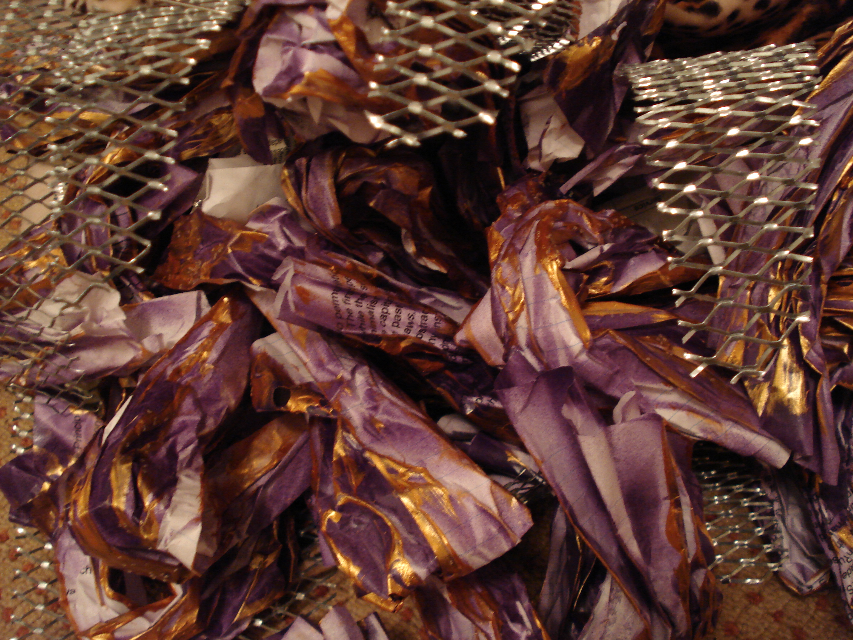 I made the sort of body/ribcage out of the metal from RAoK/SAoB2 and covered it with the fake leopard, blue zebra, and fluffy black fur from Furtive Interiors. I kept most of the ribcage exposed to give the sense that this thing had been lying on the side of the road so long its entrails have been almost entirely bared by the elements/other animals feeding on it. The entrails, of course, were made of purple-and-gold-painted crumpled up paper, and sort of exploded out of the metal mesh (I hope). I added big, empty, sad, black holes of eyes and a very long tail. I also never attached the head to the body; I think it's better that way.