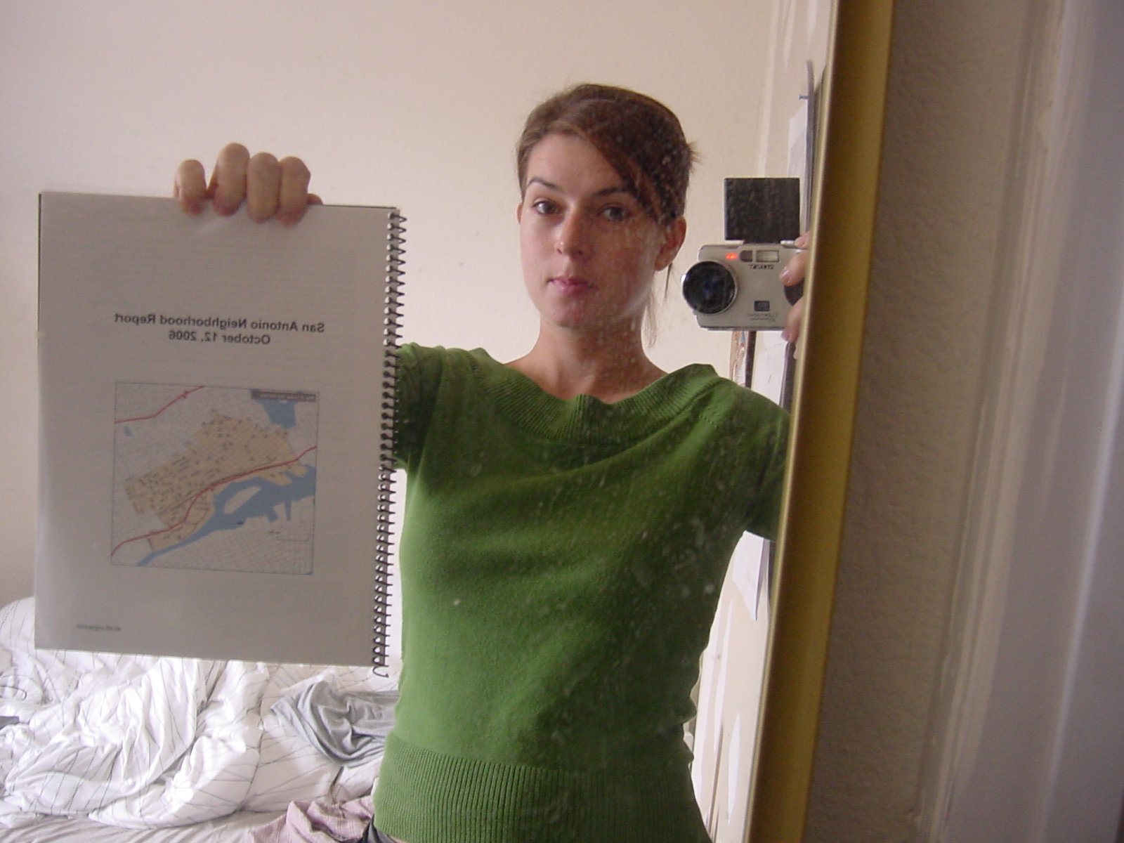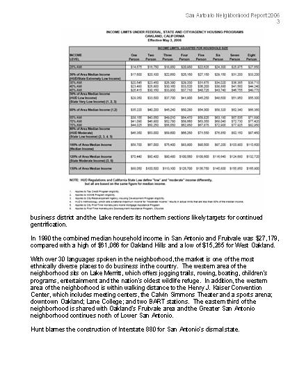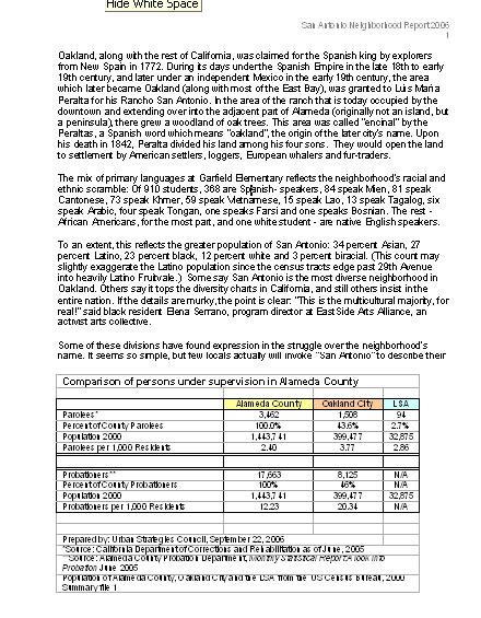 I found a bunch of sources online, and decided to use Wikipedia's entry on Oakland, some articles in the SF Chronicle, and a couple random "official reports" on the neighborhood, one funded by US HUD on diversity, and one done by some outfit called the Social Compact, apparently with the purpose of making the neighborhood seem like it has a rosy economic future (to encourage private investment). I cut and pasted paragraphs and charts from each of these in semi-random order, and made my own "report." I was trying to do a few things: a) actually insert some interesting information; b) present the assumptions and "voices" of the different sources to the neighborhood; and c) do this in a way that's sort of making fun of, or at least quoting, the idea of an outsider who knows nothing about a place telling the inhabitants who they are and what they need. I bound a couple at my parents' office (so as to seem more professional) and put up the other pages separately on random poles in the neighborhood (so as to seem less professional). I attached one bound report to a "Historic San Antonio District" sign, and the other to a stop sign near the "San Antonio District Burger King."