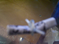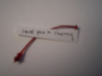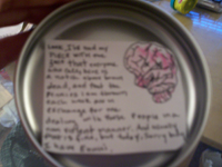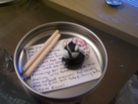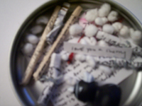 I envisioned meticulous actions as my ideal form of crazy. To create this level of intensity I used as small a container as I could and painstakingly wrote insane and hostile messages on scraps of paper made them into scrolls. I used a larger (relative) piece of paper and wrote a bit larger the rant of an employee (large enough to be legible—unlike the scrolls). To the kafka on crack statement in the bottom of the mints, I added more rants onto broken chopsticks and rolled small snow balls out of cotton. This has all been sent to a well-behaved son of a police officer in Brooklyn.