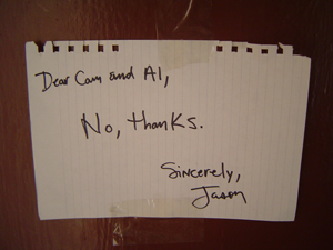 Before I had left his apartment the previous night, Cameron had mentioned that he was going to Fritjas in the Hayes to meet Britt for lunch today. I decided against it, opting instead to go to lunch with Helen to Bocce in North Beach. Unable to call him and tell him not to com over, I wound up leaving this courteous note.