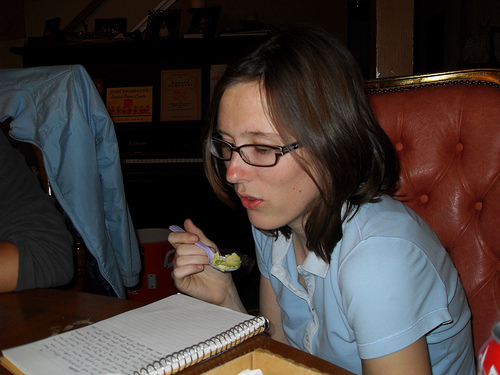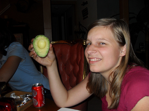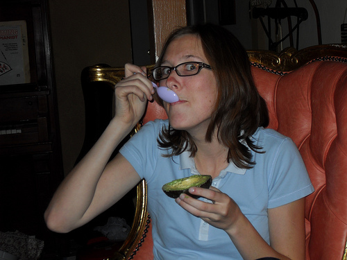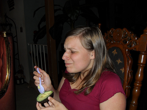 "This was the most psychologically difficult food for me to eat. It is not a matter of taste with avocado - it is purely texture. It's green and slimy and alien and disgusting. I closed my eyes and shoved a piece into my mouth. The first thing that hit me was the salt Jenna sprinkled on the alien substance. My teeth sank into the slippery, sickeningly soft mush. The slime slid down my throat, the most disgusting, green, gooey, gross substance I could imagine. Who eats this? How does this even look edible? Gross gross gross. Rating: 1 star"
