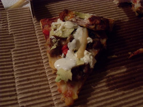 At some point during our taste-fest, we decided to make the most hated pizza imaginable. This is PMS pizza, slathered with mayo and ranch, topped with a hot wing, a slice of avocado, and a french fry, and sprinkled with some red hots. GROSS.