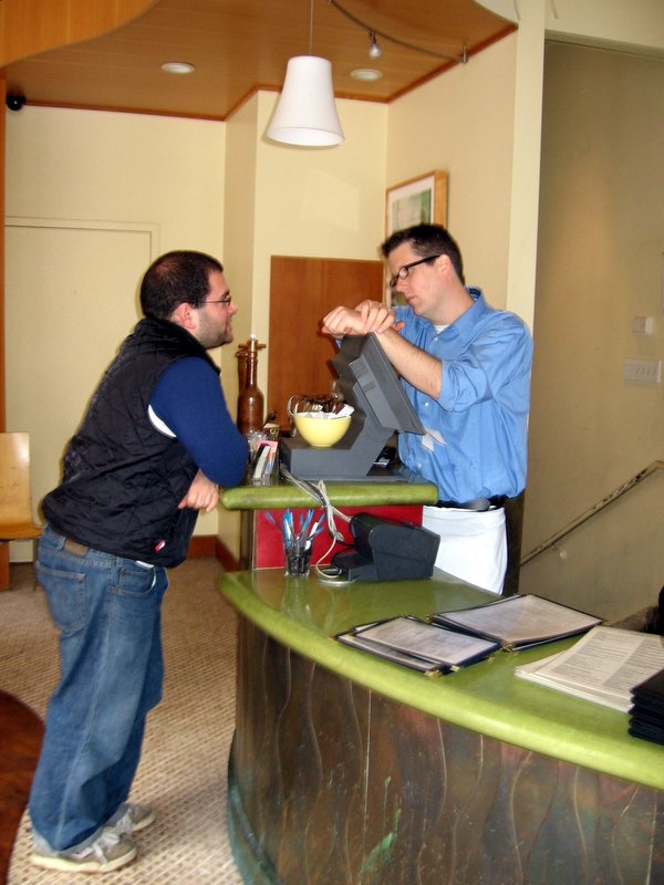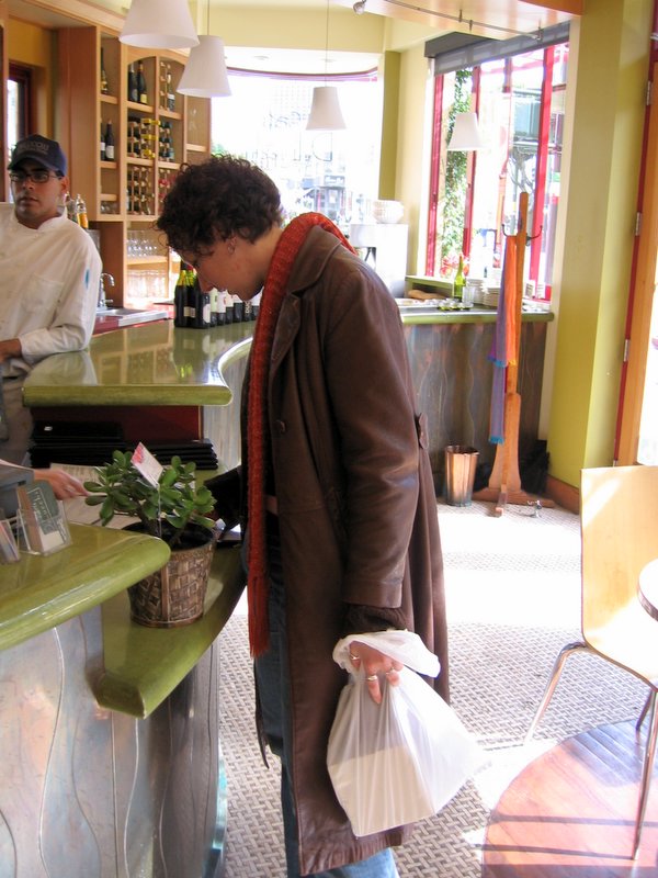 “Flower shops? Huh? What is this, an elaborate joke on me?� our idiot responded. Luckily, the other host informed us of a nearby shop where we purchased a lovely potted plant and decided to put it somewhere that had become close to our hearts... The Cafe Delucchi! We returned to what had quickly become home base and Kelly stealthily set the plant on the counter as she ordered a coffee.