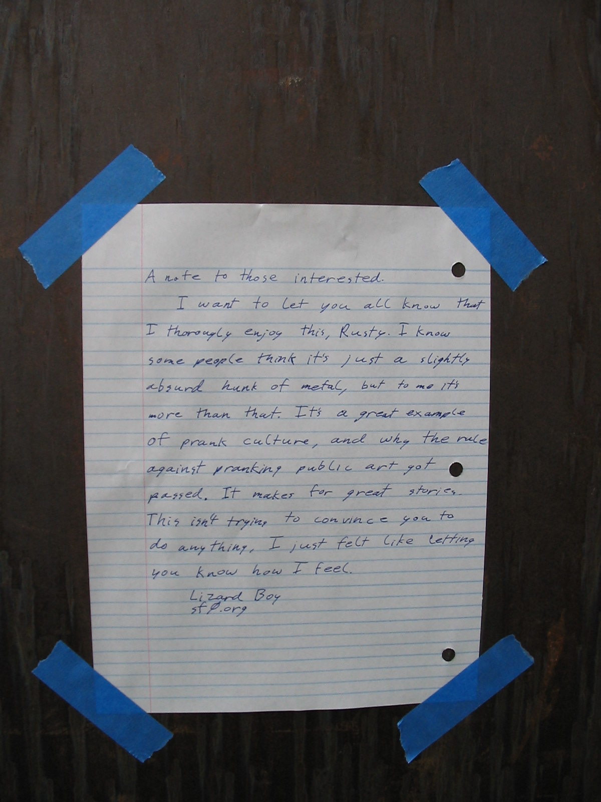 I love your story of how "Rusty" came to be. Perfect example of thoughtful, witty pranking that isn't necessarily destruction or defacing property... rather, just adding to the artfulness, methinks. Lovely!