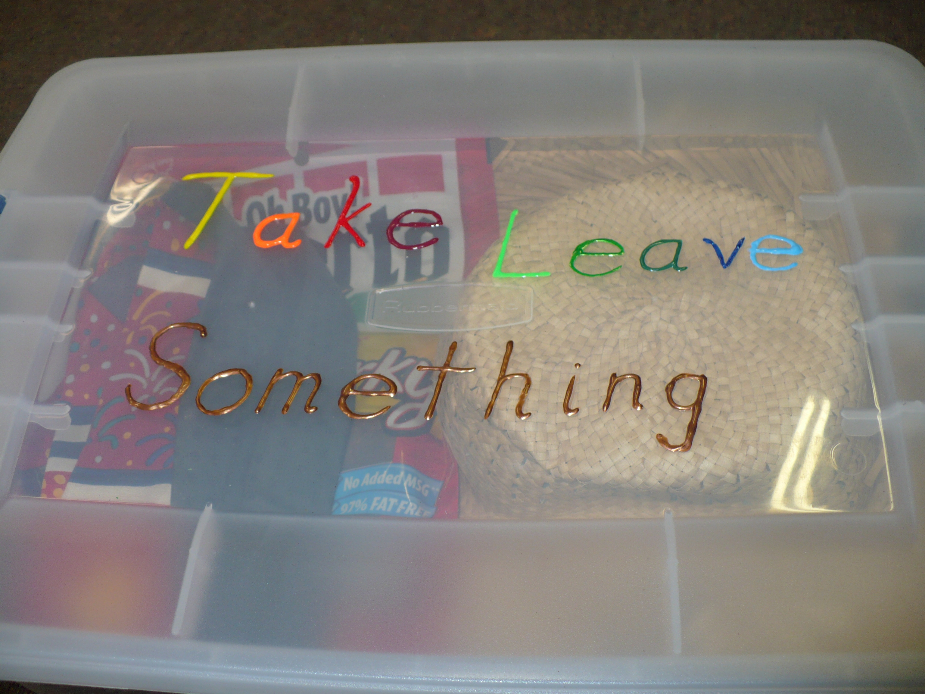I was part of the summer staff at a camp this summer (which is, incidentally, the reason i've been extremely inactive), and when we're off-duty there's an outdoor area with several decrepit couches that most people hang out in. What better an area than that, i thought, to set up a take something leave something box? It's high traffic, and a group of people that appreciates quirkiness.