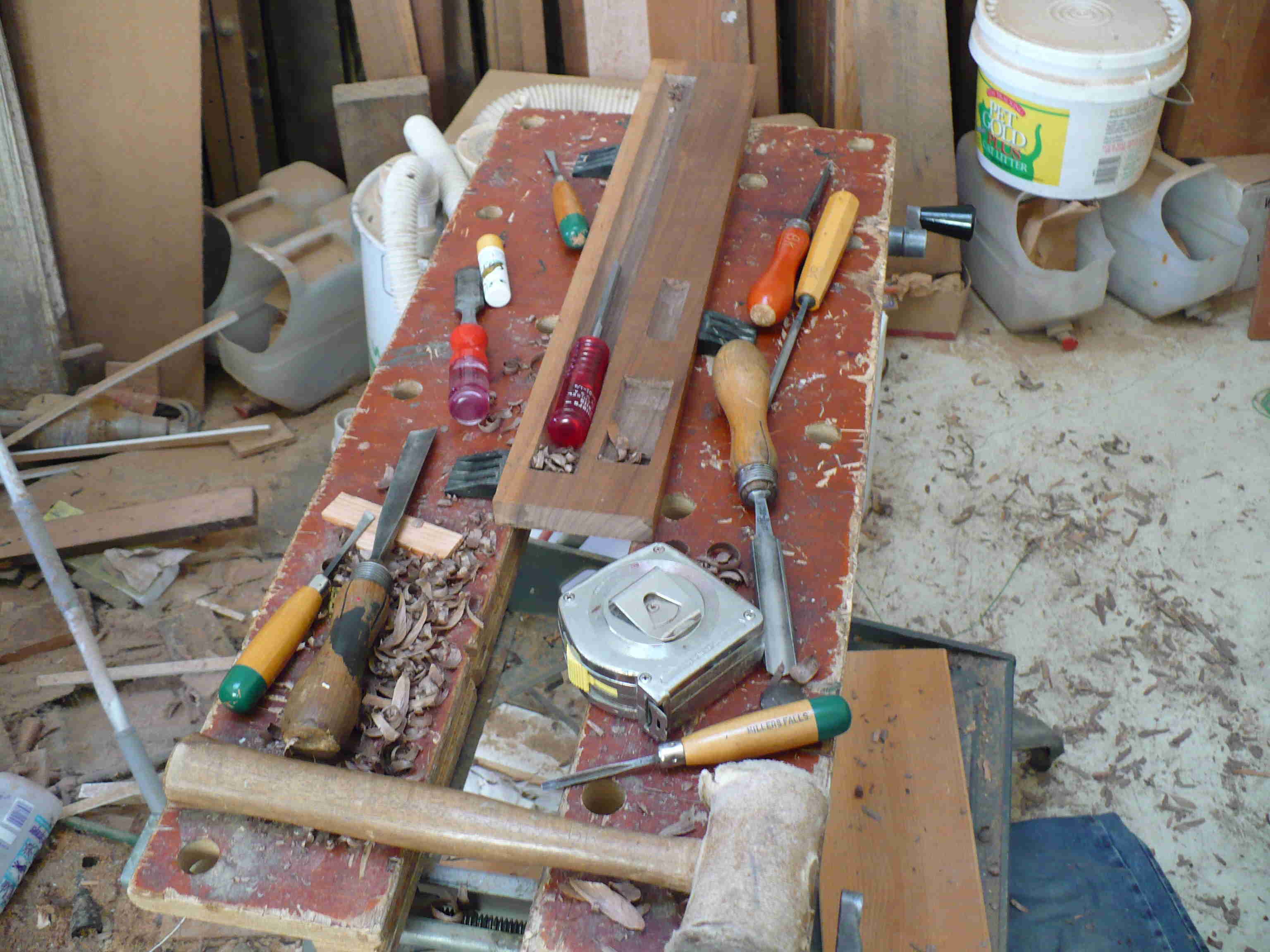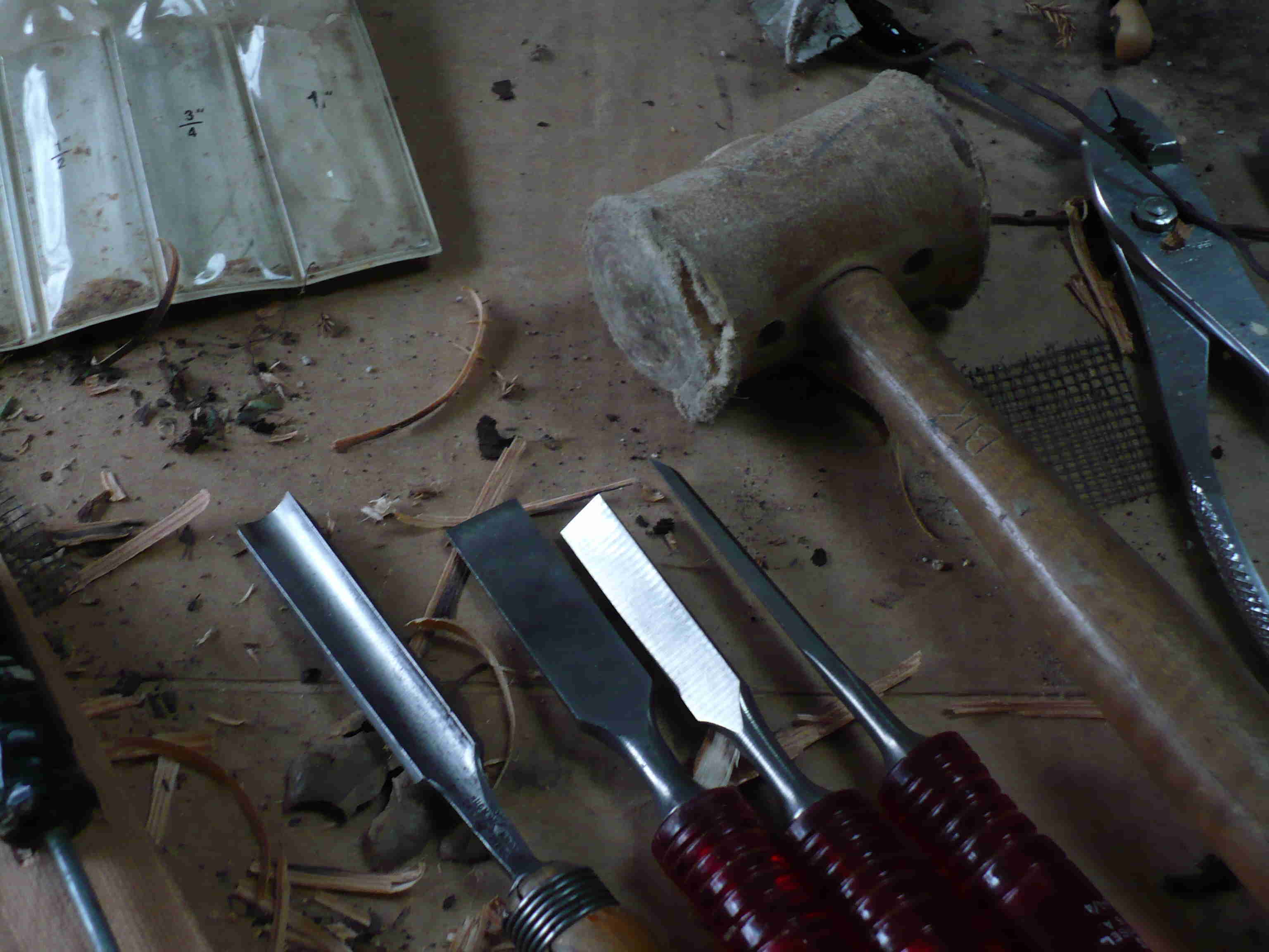 The tools I used for this. By the way, if you're cutting cross grain with a chisel, and your thumb is above the edge of the wood in the direction you're cutting, try not to slip. Chisel wounds bleed fast.