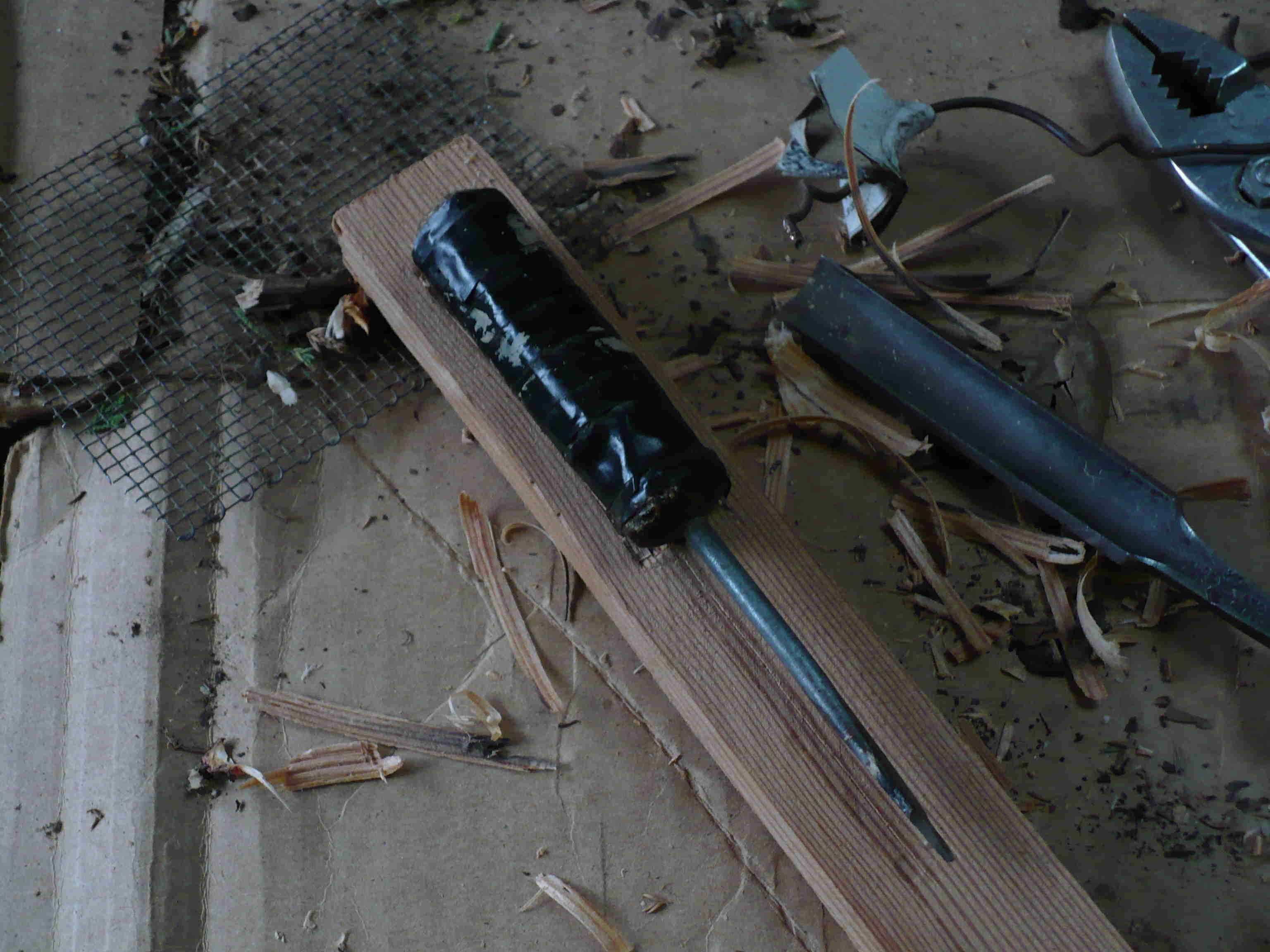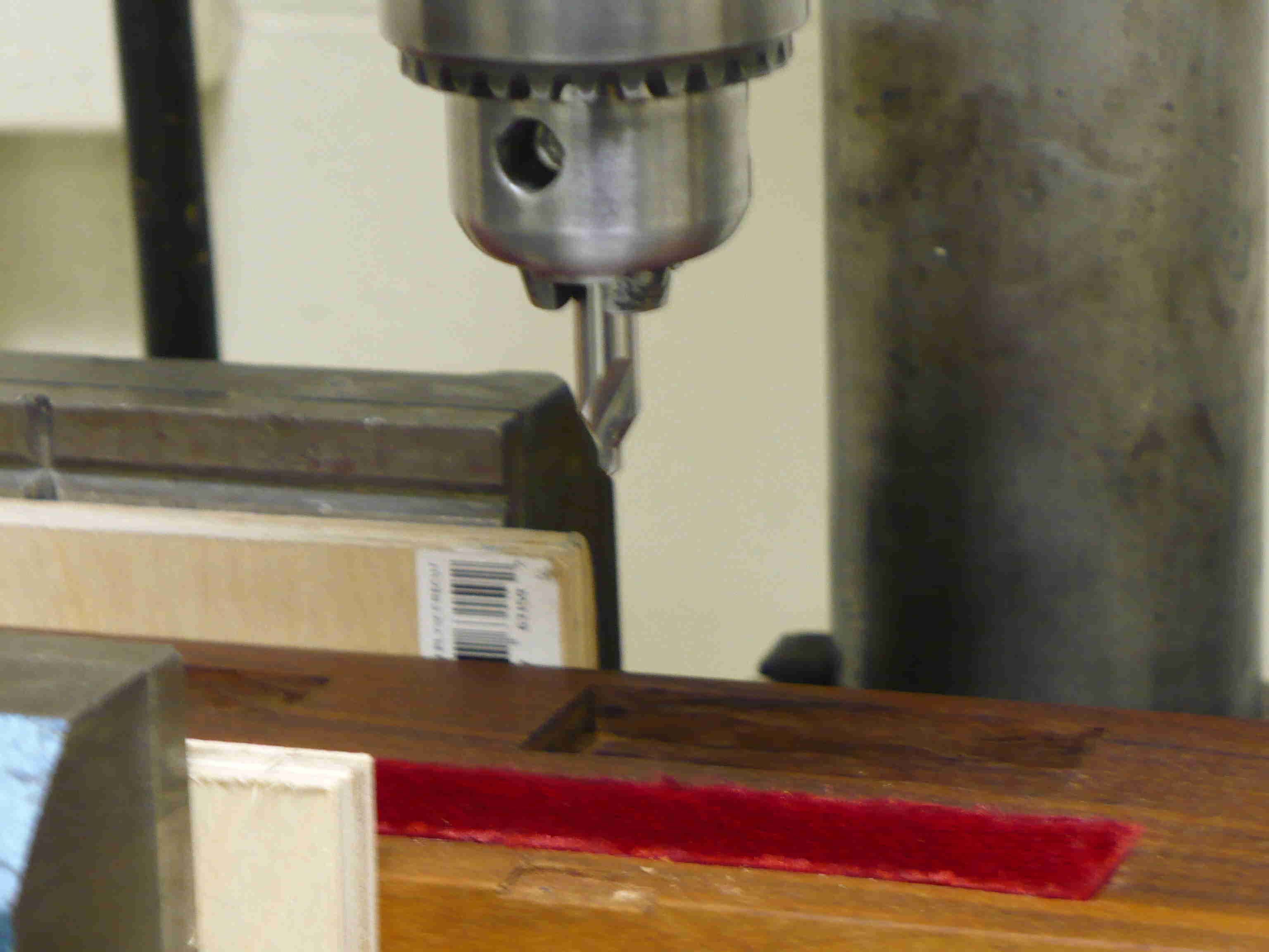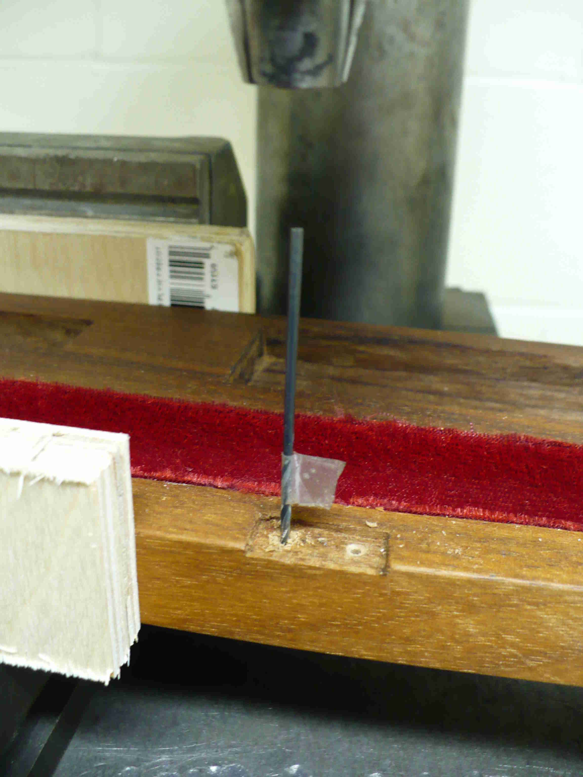 And note the drill bit's width. There were about 10 full turns of the chuck key between the widths, and the chuck was extraordinarily hard to turn, so I couldn't do it by hand. The tape was a depth gauge. When it started sweeping away the sawdust around the hole, I knew I'd gone to the right depth.