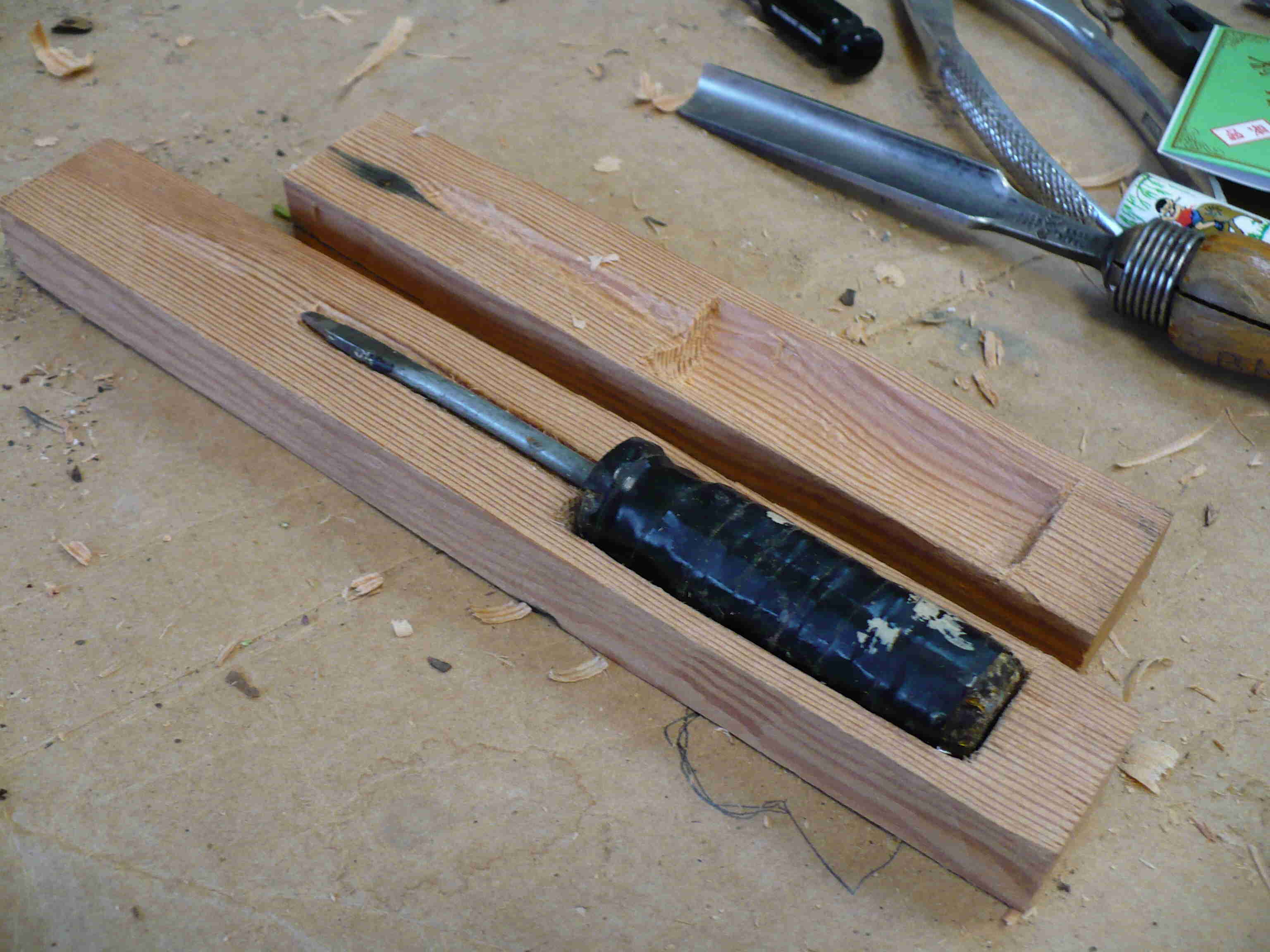 The first thing to do is make a proof-of-concept. If it ends up being ridiculously hard to make a case for something round, I need to figure out a good way to do it before starting on the final product. So I made a "case" out of some blocks of pine for this screwdriver.
