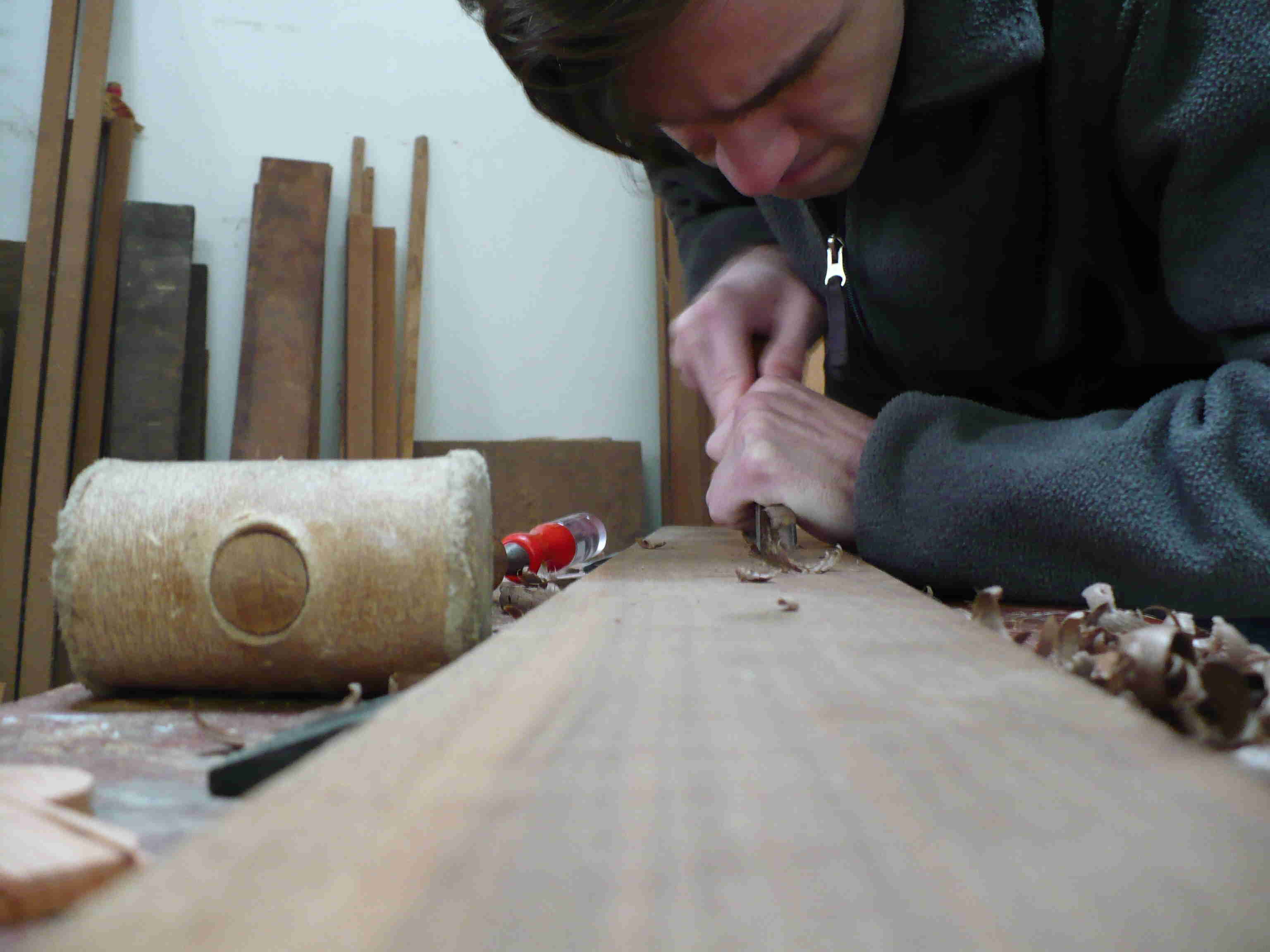 The workshop. Against the wall is a dizzying array of wood. I picked a plank from it based on what was soft enough to carve, hard enough to be sturdy, and looked nice. Final verdict: walnut. The biggest problem with this workspace is that the work bench is about hip height. My back complained at me a LOT for cutting walnut with a gouge (requires no small force) while bent almost completely over.