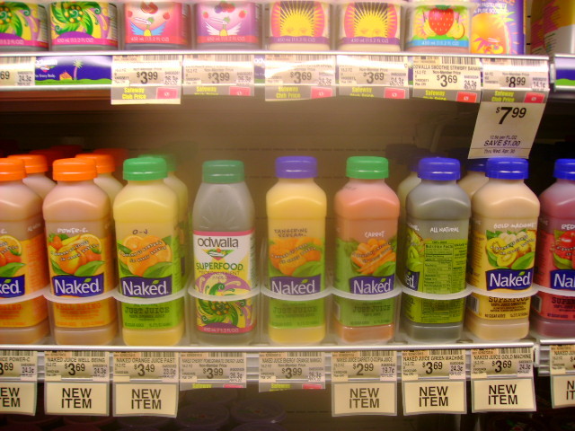 I get free Naked Juice (let's just say "I know a guy who knows a guy") so my fridge is typically full of the stuff. The Safeway nearest to me recently started selling Naked Juice, but I have access to flavors that Safeway doesn't carry. So I decided to take one from my private collection and leave it in Safeway. Nobody would suspect that in this array of many juices there would be one that didn't belong. All the more diabolical, yes?