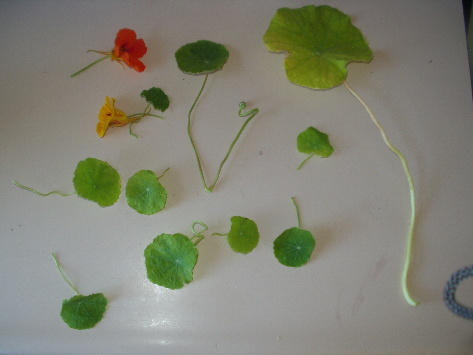 I picked a few stems, leaves and flowers. All parts are supposedly edible. I washed all parts thoroughly, tore the larger leaves and put them in a bowl, where they became reclassified as salad.
