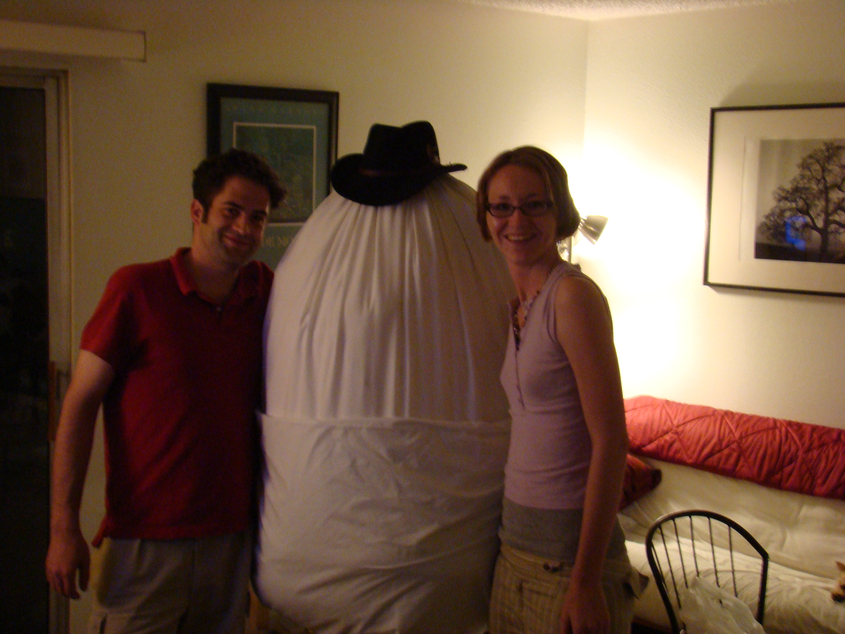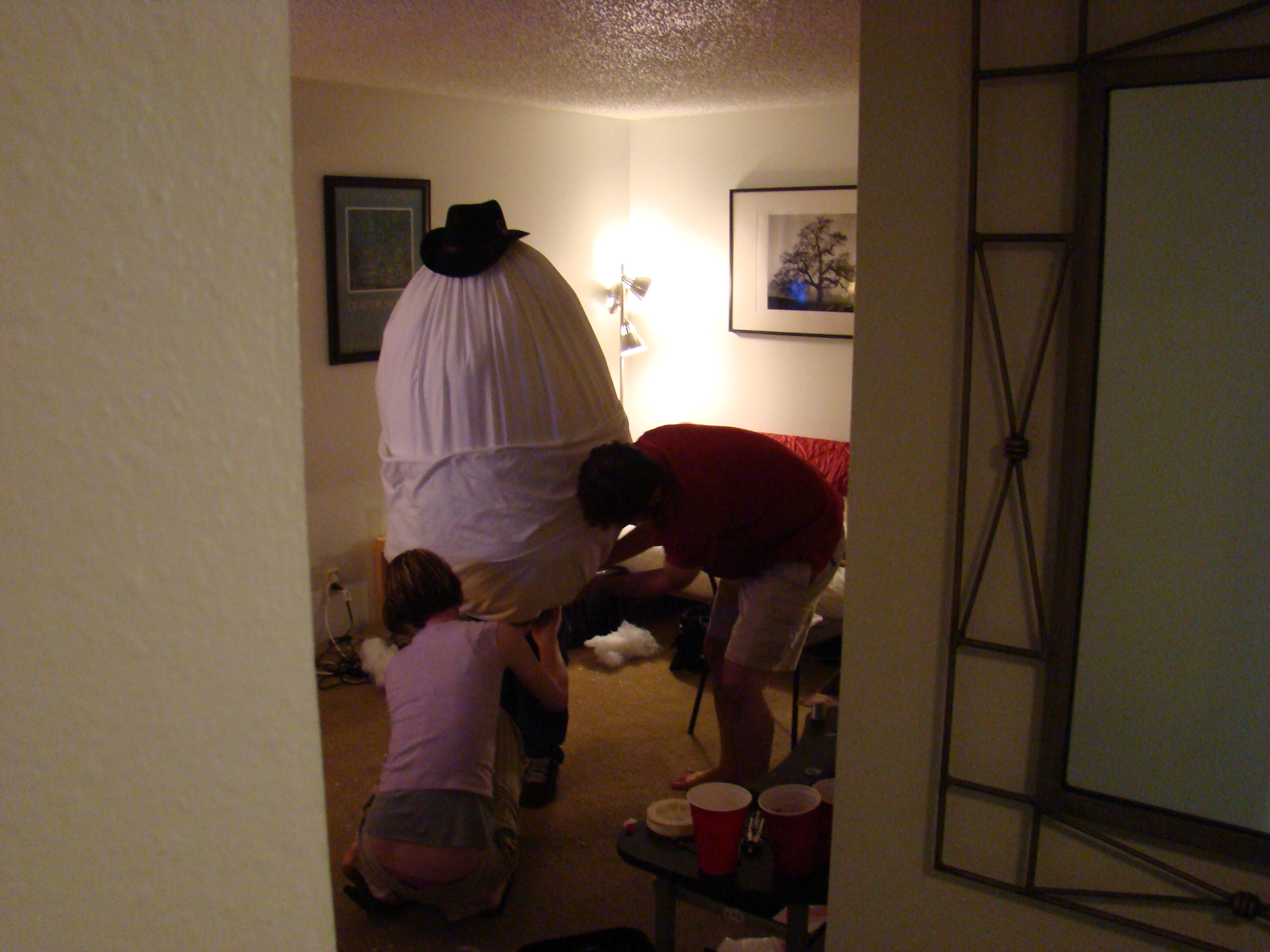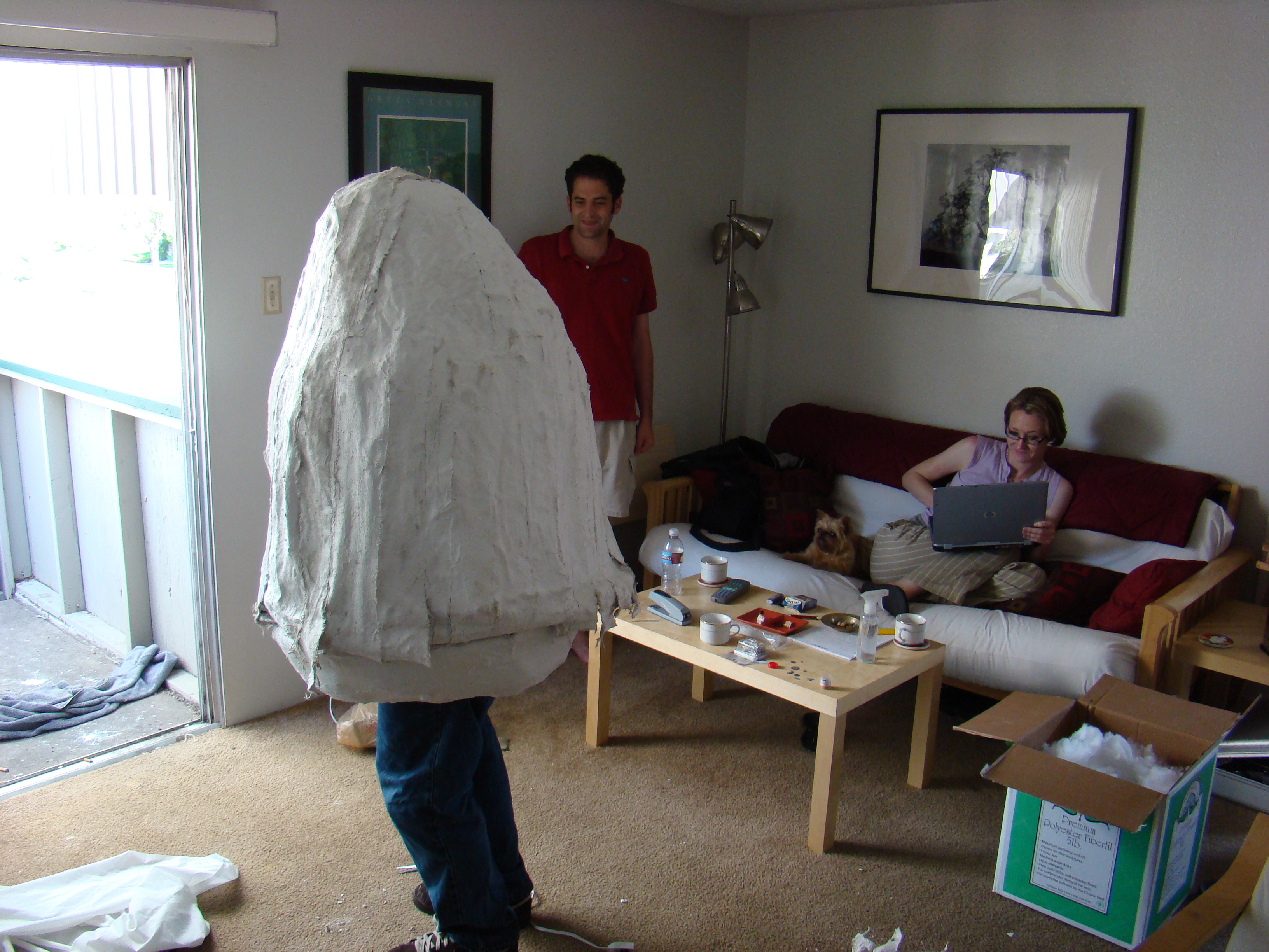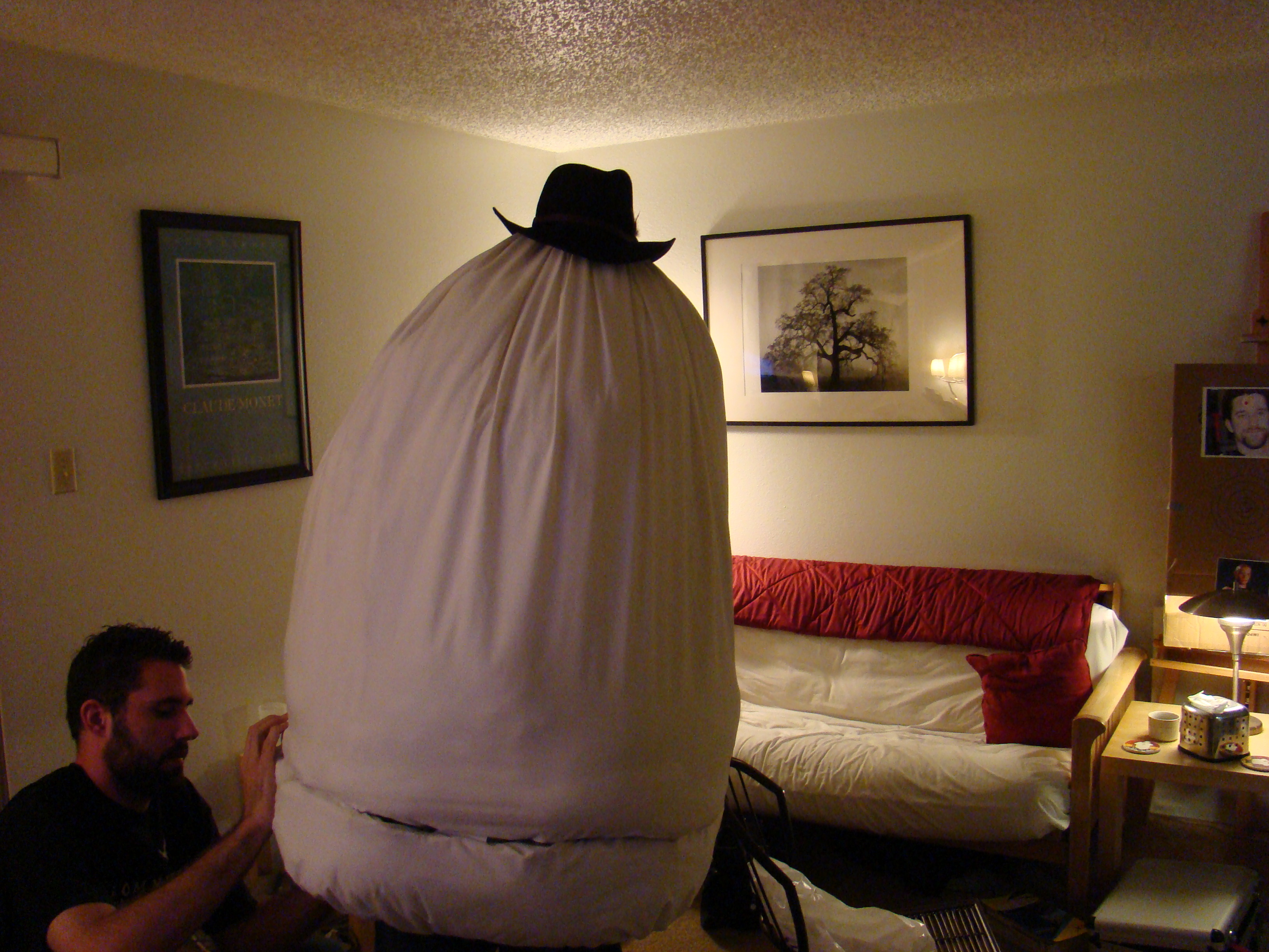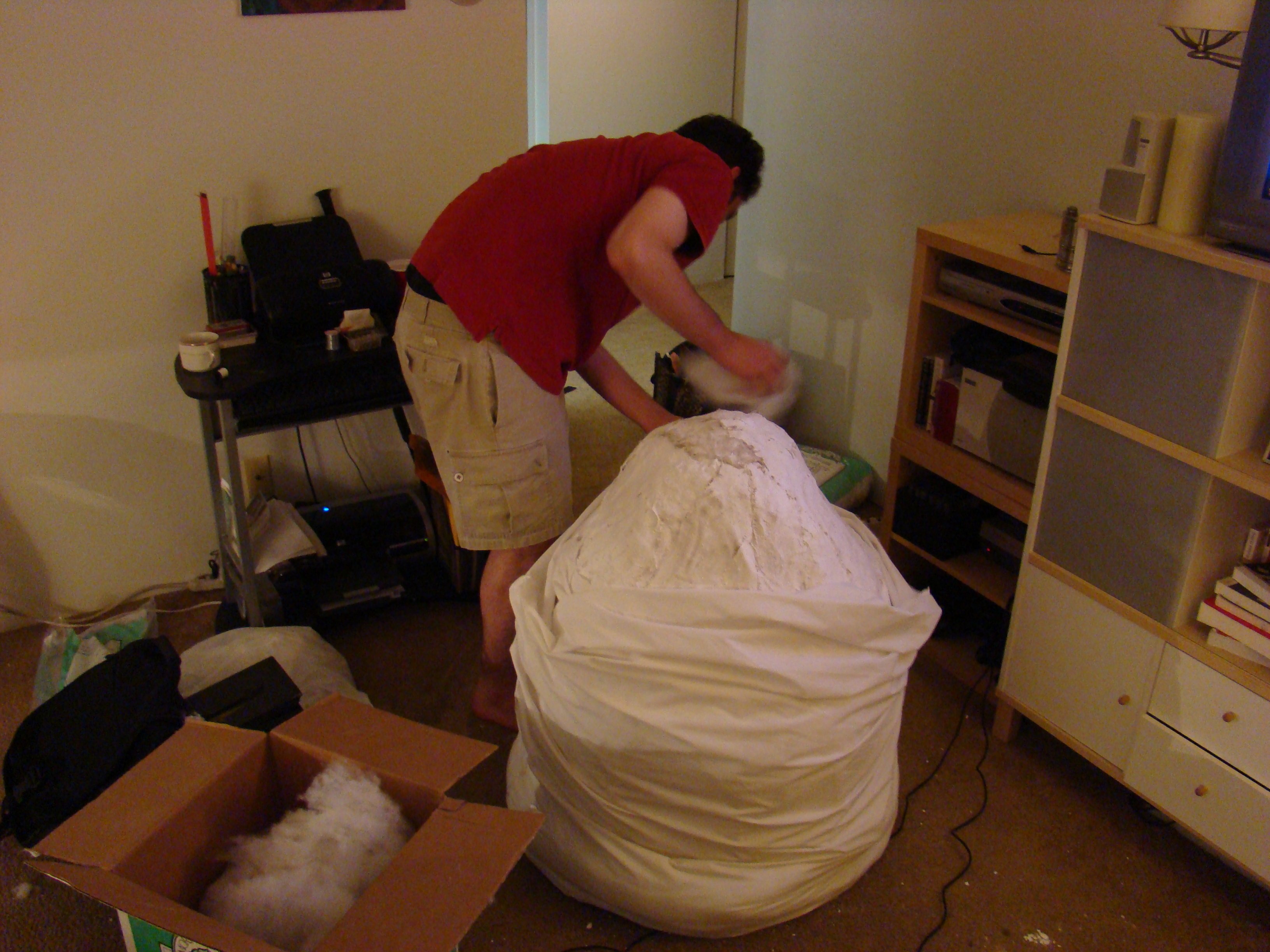 While the bottom of the egg dried solid, the top was far too flimsy and malformed. At this time John Galt joined in the task and he and Tyrone Tyrone decided on a different approach to re-form the egg. It was decided to cover the existing structure in fabric and to fill out the form using poly-fill. Initial tests with Papa Smurf wearing the costume yielded satisfying results, though there was an unsightly seam between the two halves. Cara Bear then had the idea to cover the seam with a white blanket acquired from Tyrone Tyrone's closet (there was not enough left over fabric to cover the entire seam).