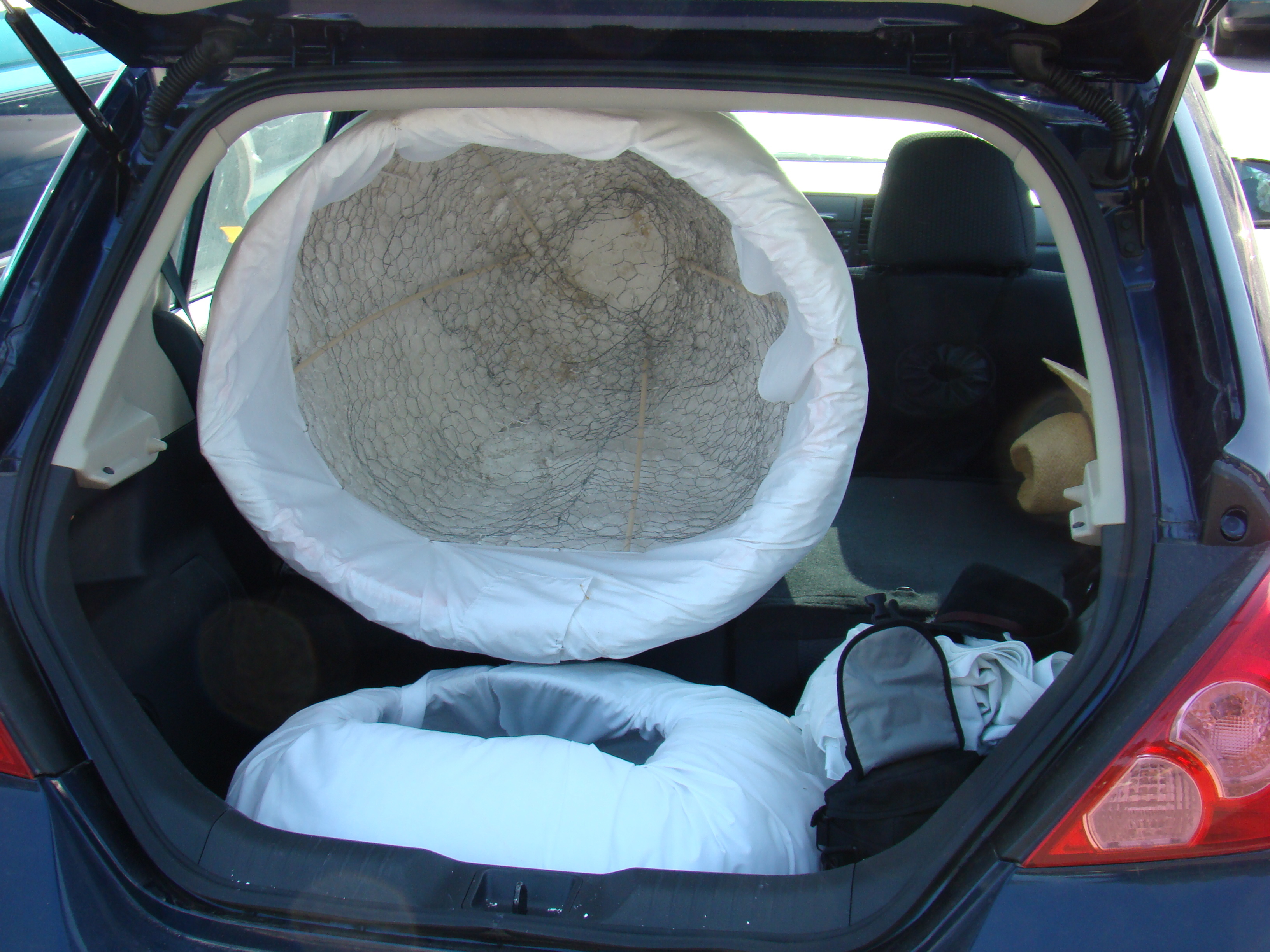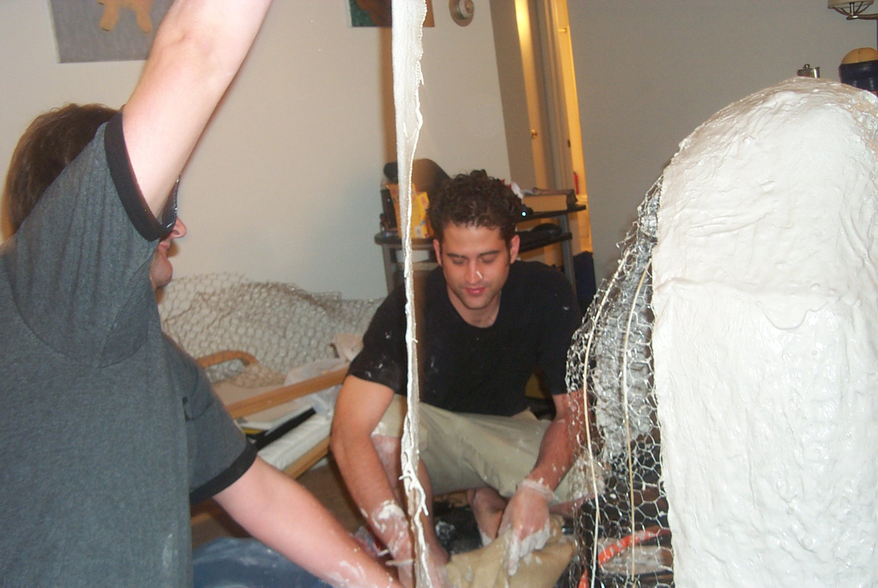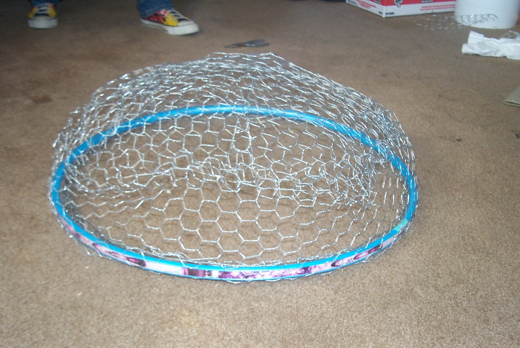 It was initially decided to create the egg by building an infrastructure of chicken-wire and coating the infrastructure with strips of fabric covered in plaster (ala paper mache). Using this method, the egg was created in two halves.