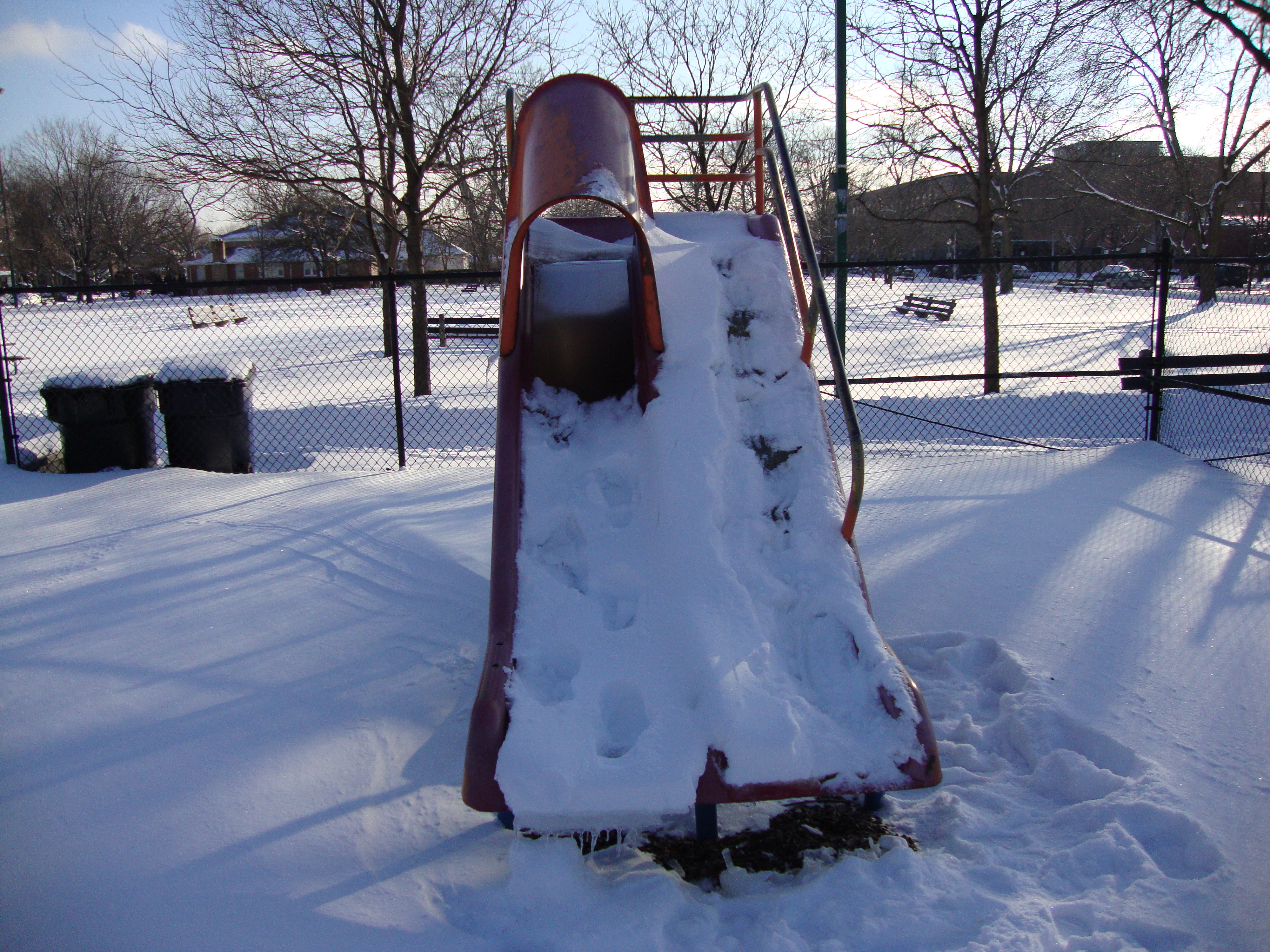 For this task I chose to return to a public park I spent hours of my childhood playing in. Ten inches of snow fell just the other day in Chicago, which gave me the opportunity to leave a visible mark of the unlikely. I looked around for surfaces to scale and found a nice metal slide. Most readers will have memories of the infamous ability of metal slides to burn your rear end off, making them near-useless on the days you want to use them most.