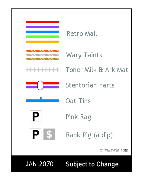 So yes, I used the Internet Anagram Server, because otherwise this would have taken ten times as much time to muddle through. Some words are much harder to make anagrams out of than others. For example, there are no anagrams in English for "Civic Center" (though perhaps proper nouns would work). For several names I had to resort to anagrams in Spanish, French, German - even Dutch! Given LA's rich ethnic heritage, I thought this completely apropos.