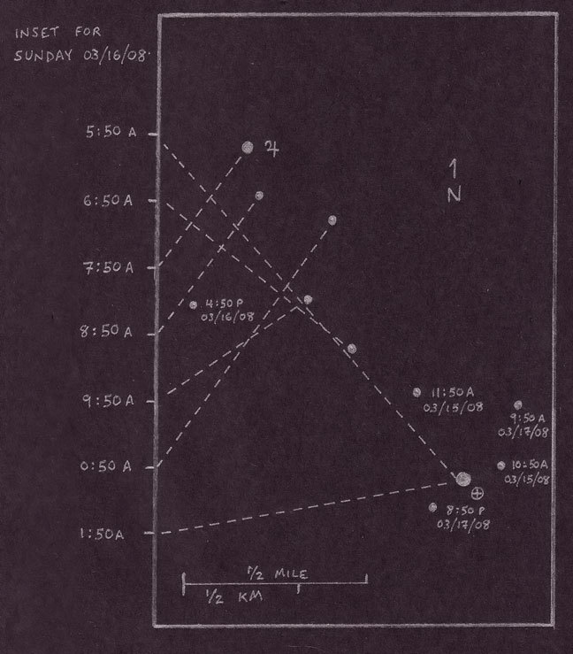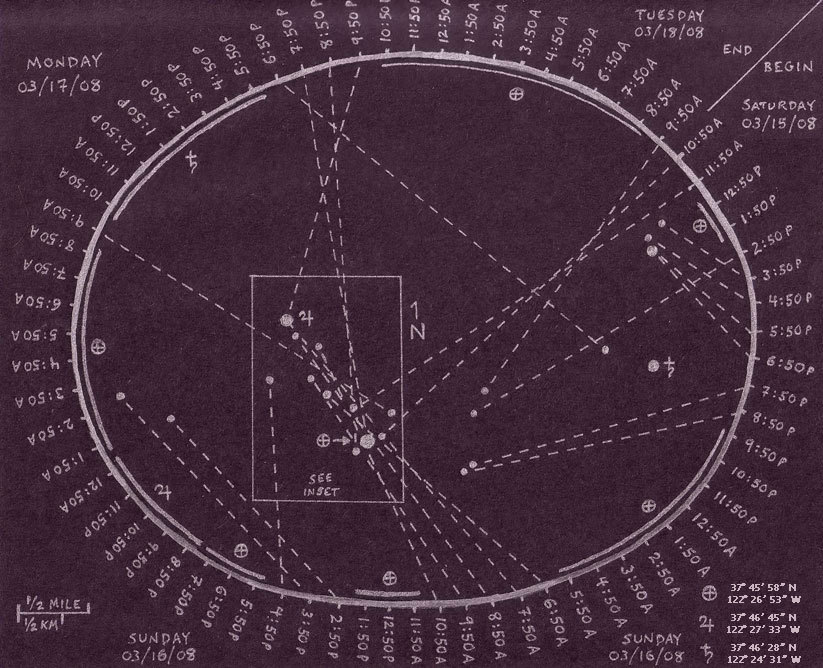It's all within an approximately four mile stretch of San Francisco. Each point represents my physical location at a specific time. The dotted lines connect each point to it's corresponding time. For points at which I was present for stretches of time, of which there are three, I assigned astrological symbols. For my home, I used a symbol for Earth, for work, the symbol for Saturn, and for our friend's house where we drank late into Sunday night, the symbol for Jupiter.