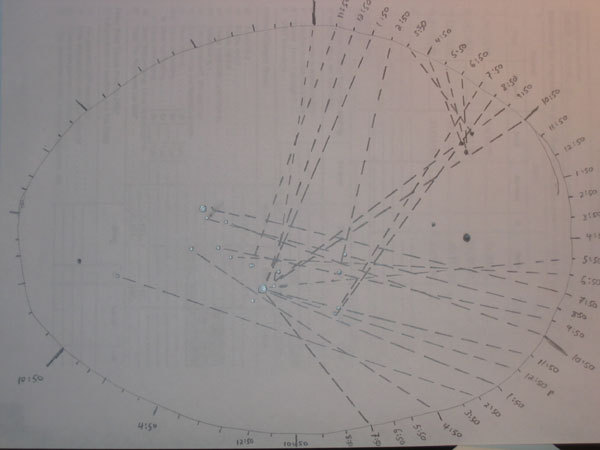 Then I had to figure out what kind of key or legend my map would use to indicate the time associated with each point. Here I decided to be inspired by the pattern of a circular clock, as well as the circular old-timey maps of the celestial sphere. I liked the idea of visually noting the sequential order of my whereabouts and thought it would be easier to note these by being able to access the points from all sides.
