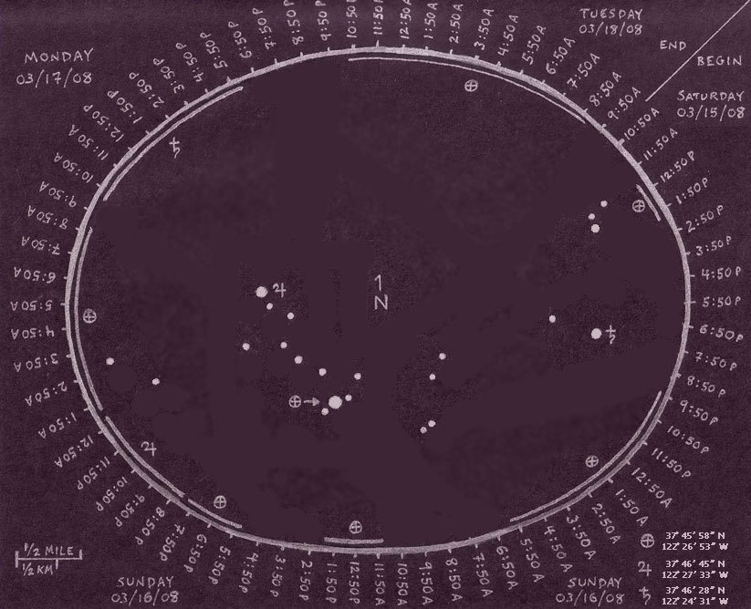 April 4th, 2008 9:03 PM / Location: 37.766245,-122.4480I guess what threw me was that the links in the task (and comments thereto) brought up things that I would not have otherwise recognized as maps. I thought it would be easy - too easy - to just make a Google map with markers for each point in time that I recorded, and that wasn't nearly as creative as the I believed Senator Unit intended for us to get when he hallucinated this task.