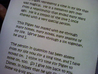 I held on to a few items, though, that were special mementos from this relationship. One of them was Piglet. This little plush Piglet, a gift from her to me, had stayed with me for over ten years, traveling from town to town and apartment to apartment with me, usually stashed away in a closet, but always there.