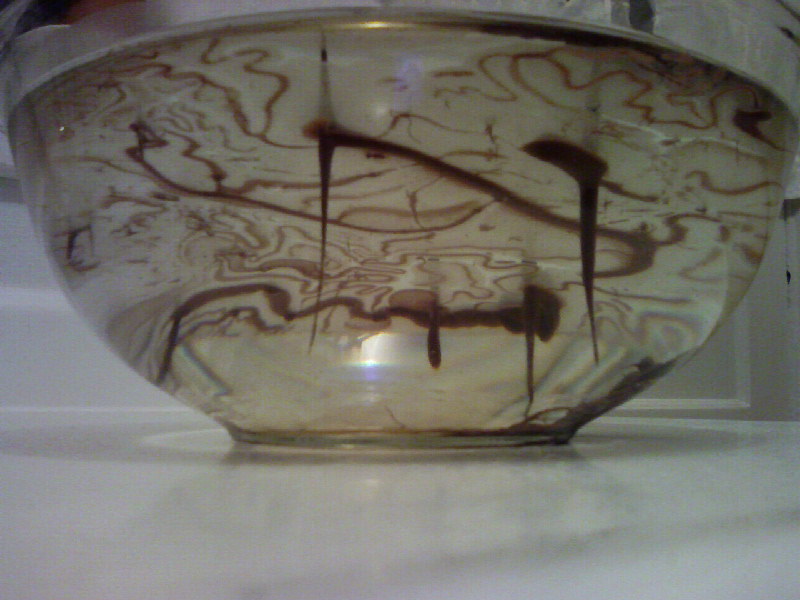 After it was all over (and tense it was watching it all happen), we carefully moved the bowl of water and chocolate to a better lit location for identifying possible portends of our future.