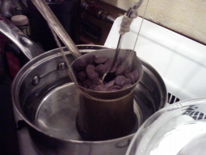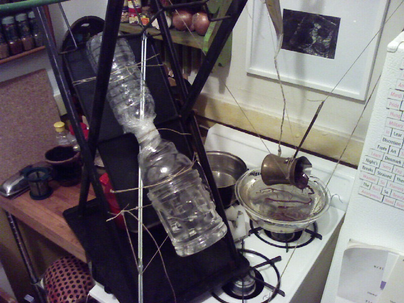 The chocolate morsels were placed inside a small pot, which was in turn placed inside a larger pot half-filled with water. These sat on the back-left burner of our stove. The small pot had two strings attached to it that held it up out of the water slightly and held it in place. These strings were attached to a thin dowel (from this task), which was held aloft by a tripod on one end, and more string tied to our overhead pot rack on the other end. A third string was attached to the handle of the small pot which, when pulled, would lift the pot out of the large pot and dump its contents into the bowl placed to the right of it. This string was attached (after a couple of pulley points on the pot rack, etc) to a long arm that was part of a see-saw mechanism on the front of the stove. The see-saw was actually a small metal folding table that we had found on the street, placed here upside-down. On top of the see-saw were two plastic bottles connected mouth-to-mouth, one of which was 75% full of water, the other only 10% full. The metal arm was on the end of the see-saw with the mostly empty bottle, and the arm served as a counter-weight. This end of the see-saw had to be held in place by another string, tied to the leg of the table to hold it in place. Releasing that string would cause the see-saw to tip, the water to travel from one bottle to another, and the arm to move downward, thus pulling the string attached to the handle of the small pot. Also attached to this string was yet another string, which was holding in place the dagger, The dagger was suspended above the pots on its own string, which was wound up. More string was used to dangle a small spoon from the end of the dagger, which rested inside the chocolate morsels. Releasing the dagger would set it and the spoon spinning, thereby stirring the chocolate. By this time, the water should be boiling and the chocolate melting. My hope was that it would take a while for the see-saw to tip, allowing more time for the stirring before the pouring. Both of these actions would be triggered by one final string, attached to that key string that was holding the see-saw in place. This string was tied to that string, with its other end resting under the large pot, right next to the burner. Phew!