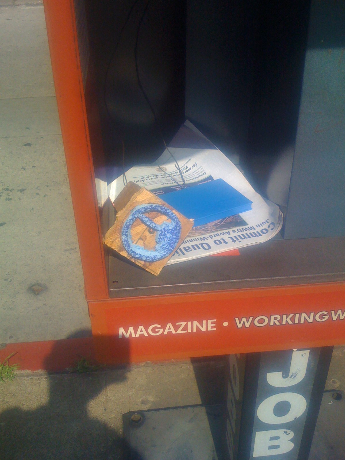 So then came the day of the race. That morning I made the mechanism to attach the stamps to their locations at the two unmanned stations. I gathered up all of my props and headed out. I called Loki on my way out to see where he was and what he was up to. When I called he informed me that he was in the Hollywood Forever Cemetery. I didn't know it at the time, but he had just finished not jaywalking. So I picked up the Loki and we went off to Astro Burger to install the first stamp. We wandered around the establishment looking for the perfect place to put it when Loki came up with the idea of putting inside a free newspaper stand. Genius.