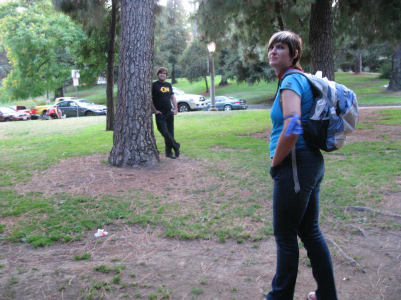 The first player to show up was LeftHandedSnail. We were sitting hidden ninja-like in the shadows of a tree so were made invisible from the outside, so we saw her before she saw us. I had to go get something out of Piper, so on my way to do that errand I bekoned her over to our table and she helped roll up her own blue and red ribbons, both of which would be used that night. When I'm sure I know that everything is being handled, I call and check in with all of my checkpoint agents. Lowteck is supposed to man checkpoint one and is running late being stuck in West Covina and unfamiliar with traffic in Los Angeles, he's manning the checkpoint with Mark II Robot so I'm not too worried as there are safeguards in case somebody didn't make it. But I have no way of contacting MKII that day, I just have his word that he'll be there. But I get calls from all other checkpoint agents and all is going according to plan.