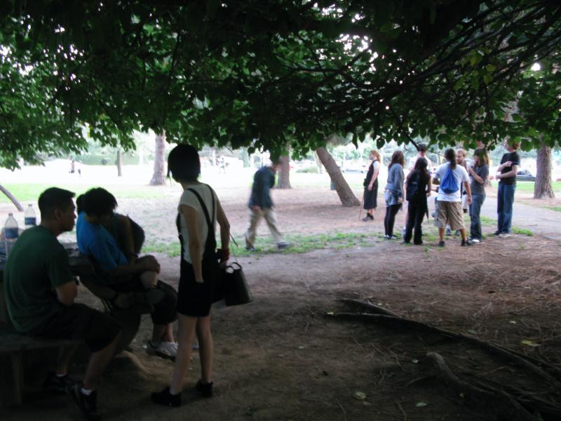 Then all that was left to do was go to the starting point and wait. And help make the rolls of ribbon. So Loki, the Captain and I rolled up fabric into little balls in a park on a nice Saturday afternoon.