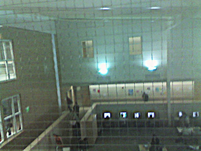 When leaving his class, Kyle must walk past the windows across the open atrium. (It's hard to take photos with a cellphone camera while pretending to talk on the phone at the same time.)