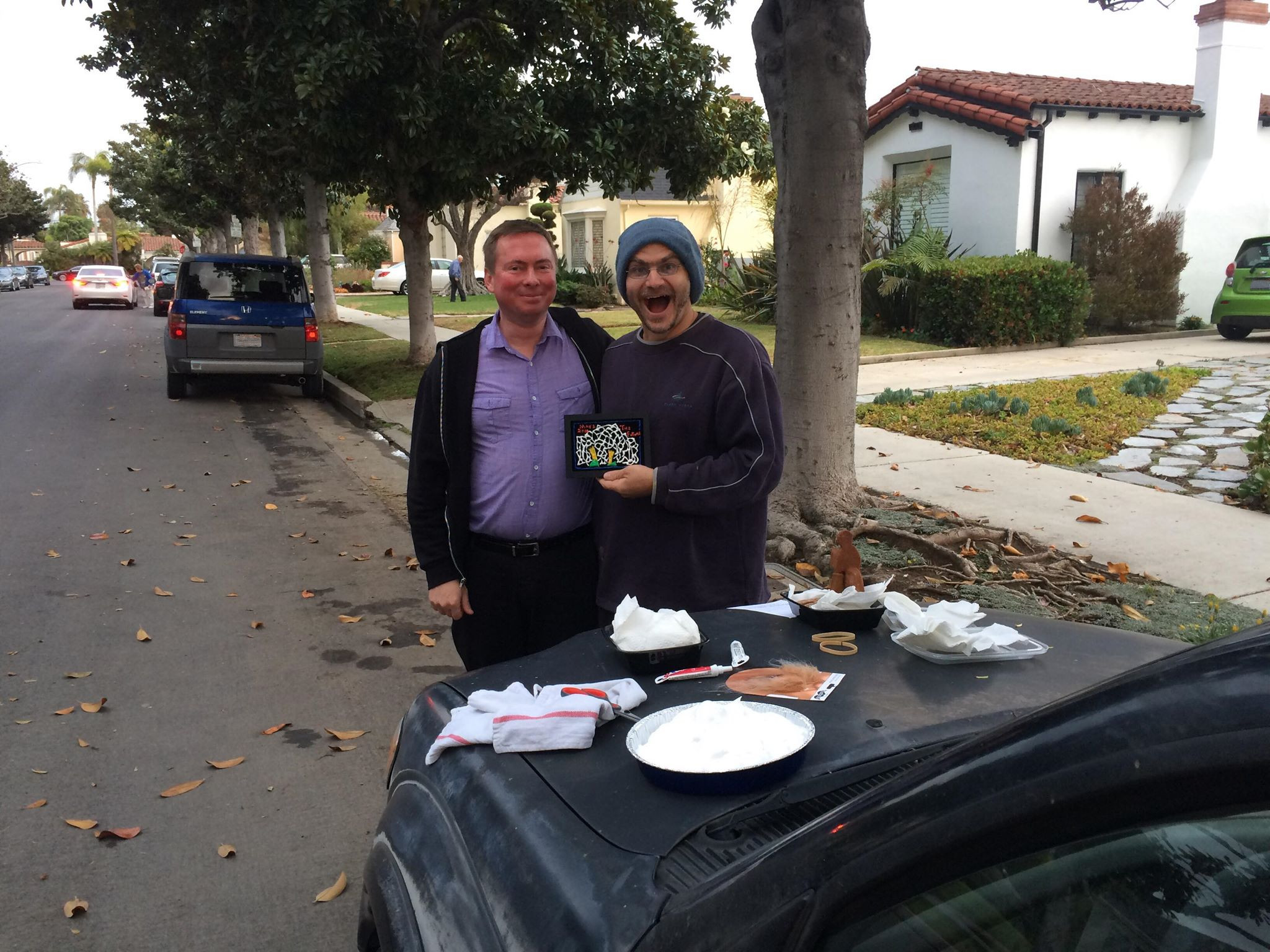 I arrived in LA around 1pm, found a quite spot to paint on velvet and bought some shaving cream with which to fill pie tins. I showed up outside of Lincoln's home around 4pm and was surprised to find his vehicle out front. I parked thirty meters down the road from him, arranged the car mirrors to give me a view of his sidewalk and front door, and began my stakeout. While I was at it, I began sending harassing text messages to distant players (or whoever now owns their ten year old phone numbers), hoping to make them think they were my target.