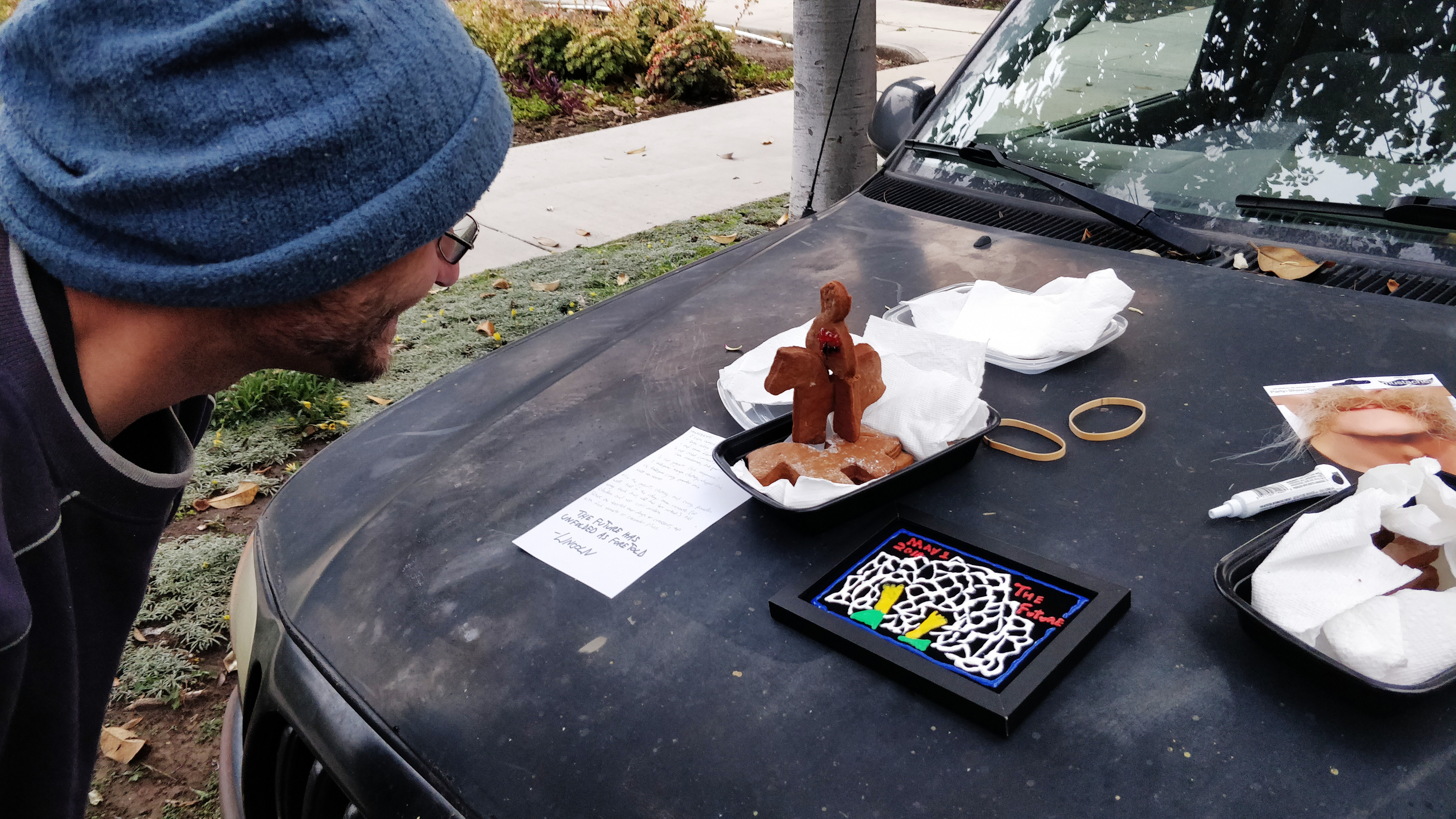 After hastily attaching my fake mustache and grabbing a pie, I crept along the line of cars. I was incredibly lucky - he had his back to me and didn't notice my approach until I actually touched him.