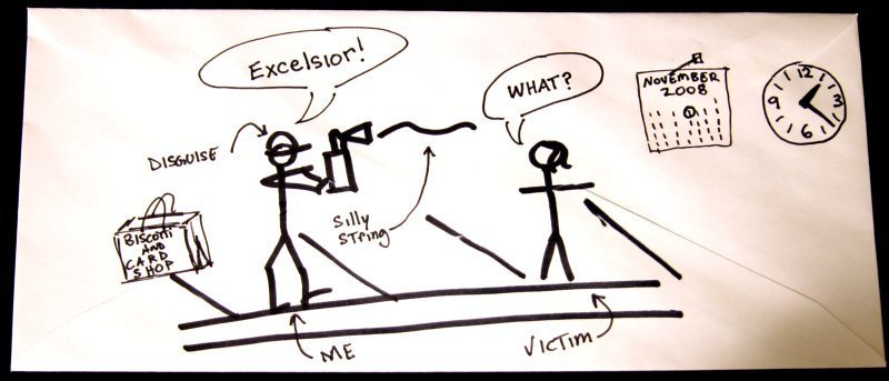 I will approach to within seven feet of the player, and then I will shout "Excelsior," while attacking them with canned silly string. I will photograph the silly-string covered player before revealing my identity.