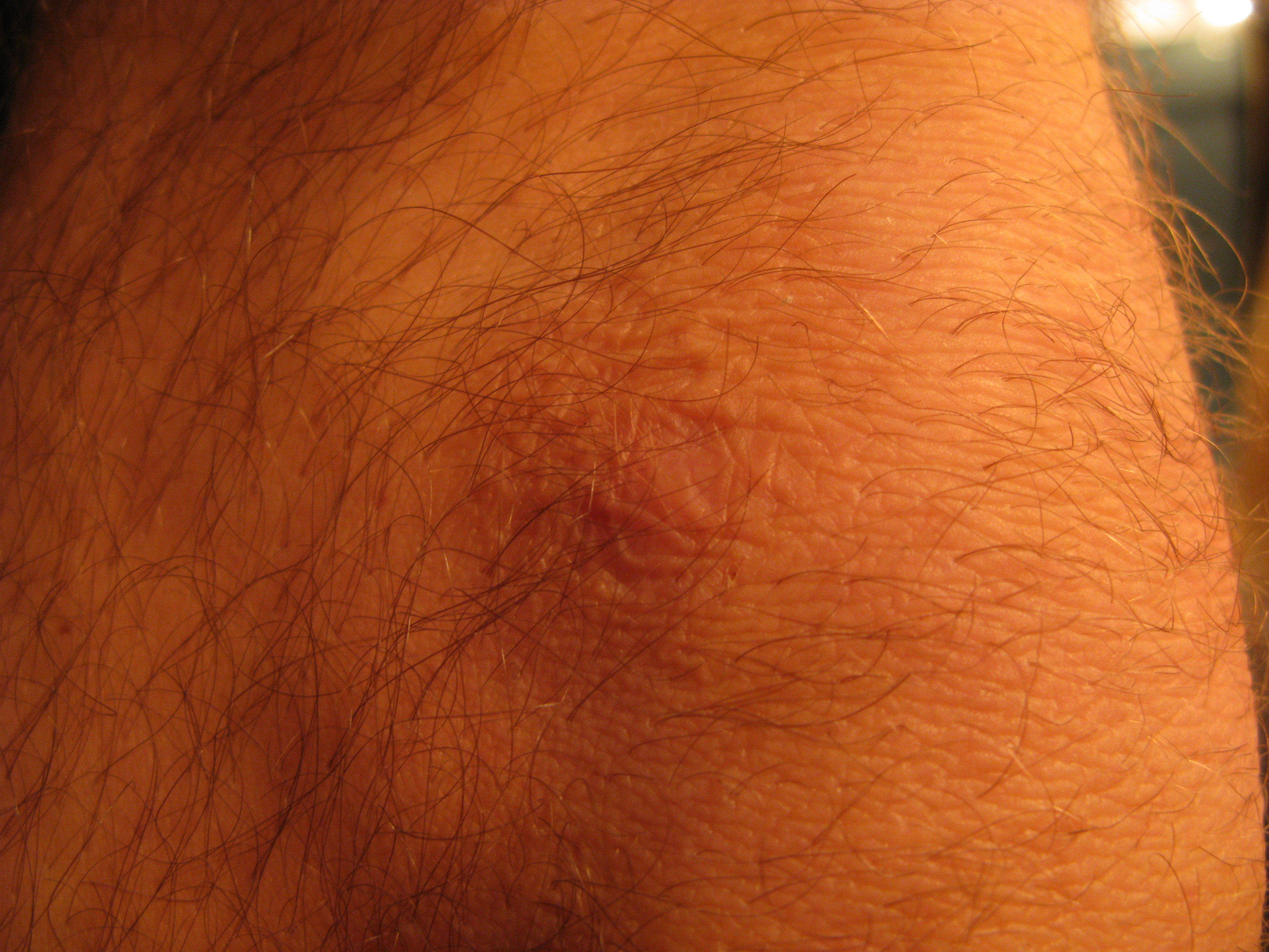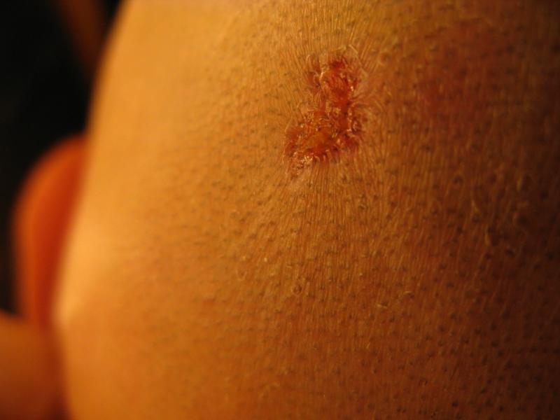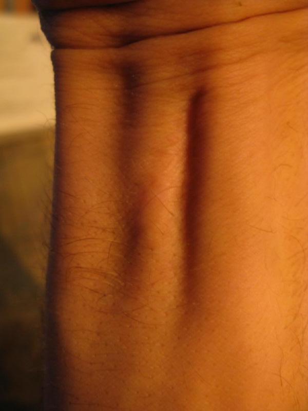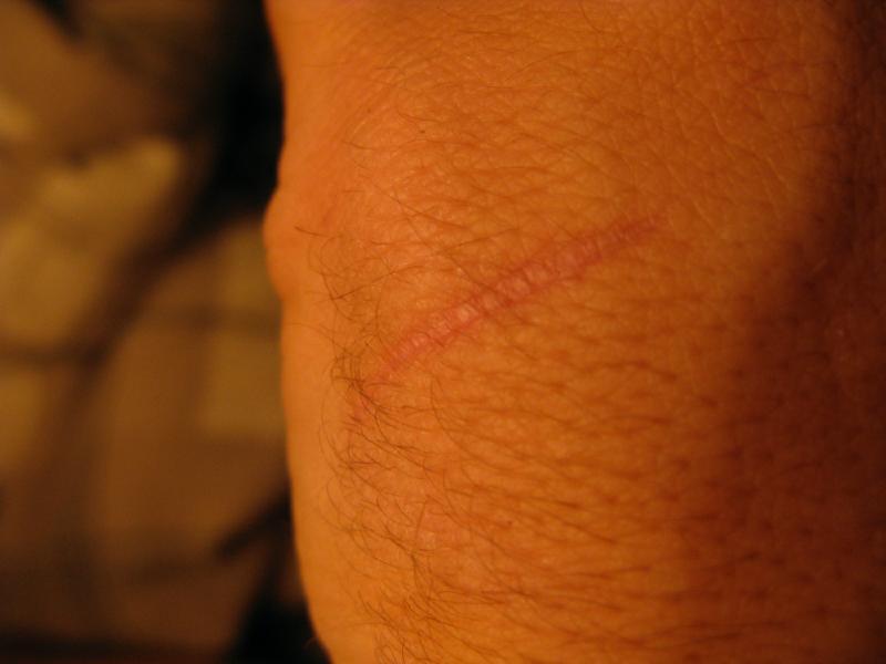Two years ago almost to the day I was in the hospital where I spent a month. I had a staph infection of my blood. Which is very very serious apparently. I was very close to being dead. Organ failure and everything. The way I got the staph infection was likely from this wound on my knee which I got playing baseball on a bad field three months earlier, I had a pebble lodged in there and it got seriously infected. My knee was twice it's size and there was a huge hole I could put my finger in two knuckles deep. It was an awful pussy mess. And I went to the hospital and it was treated and it went away. But then a few months later I got the staph. This scar is the only reminder I have of that experience.