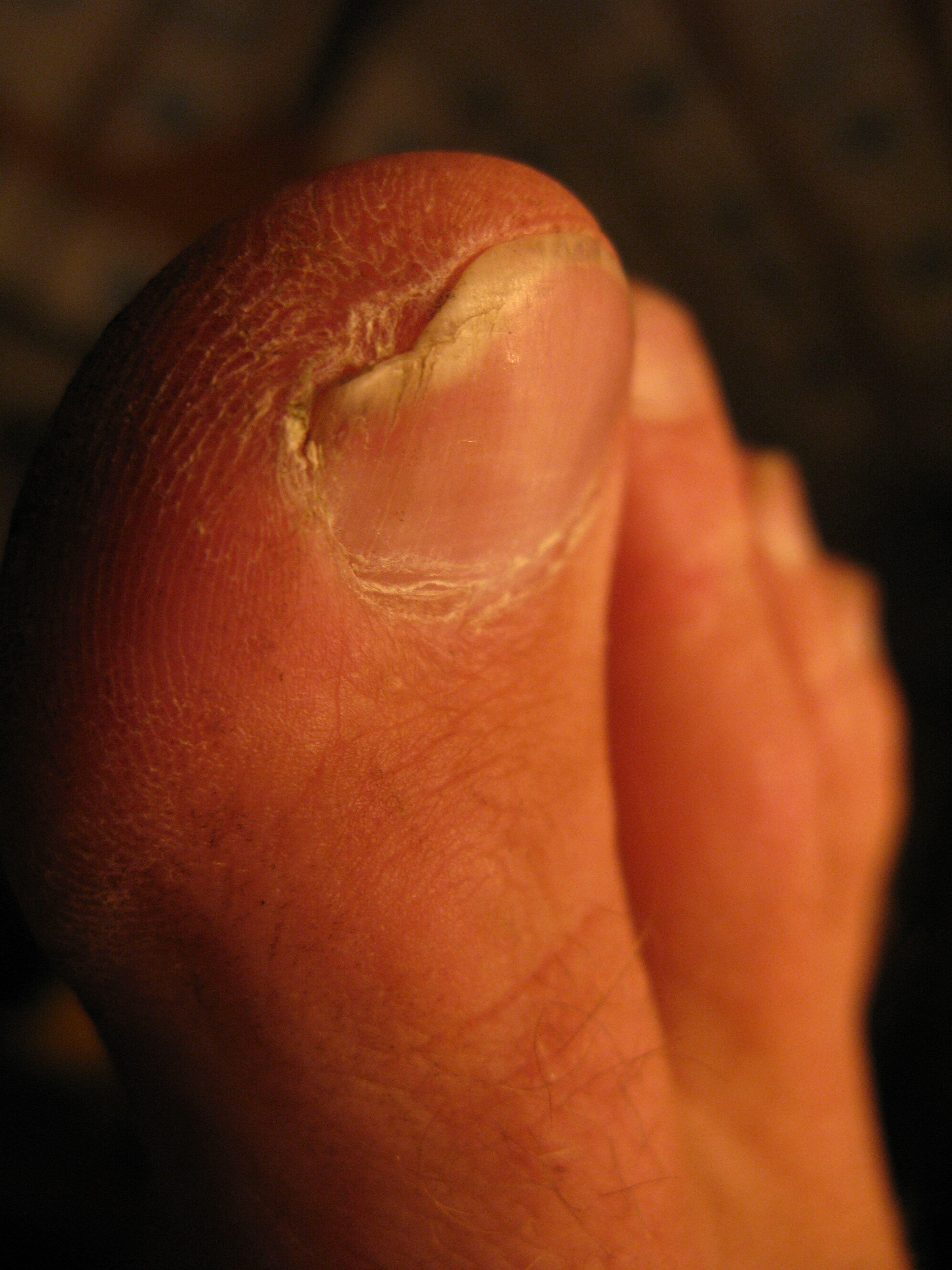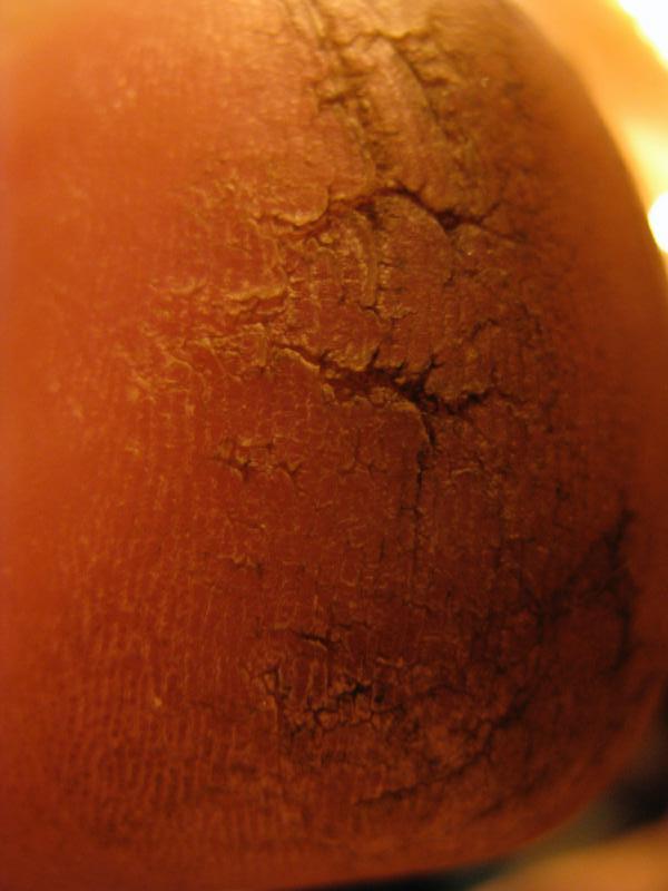 I know you keep insisting your feet are like no one else's, and I believe you of course. I would like to point out that I have scaly barbs and deep callouses too, and your heel cracks looked so familiar because I've seen cracks like that, just this morning, just now looking at my own feet. It must be the double thickness that sets yours apart--the overall callous/toughness. Because that heel crack photo feels like I'm looking in a mirror. I don't feel the cracks when I get them, there's dirt and stuff in them and so on. I'm pretty sure they happen to me when it gets really dry which also happens to correspond to winter when the air here is absurdly dry. The key difference--perhaps you do have this but I bet the toughness of your feet prevents it--sometimes the cracks get away from me and go real deep, to the point they bleed and hurt really bad. THat's my least favorite thing. The tooth hole looks familiar as well.