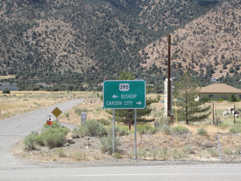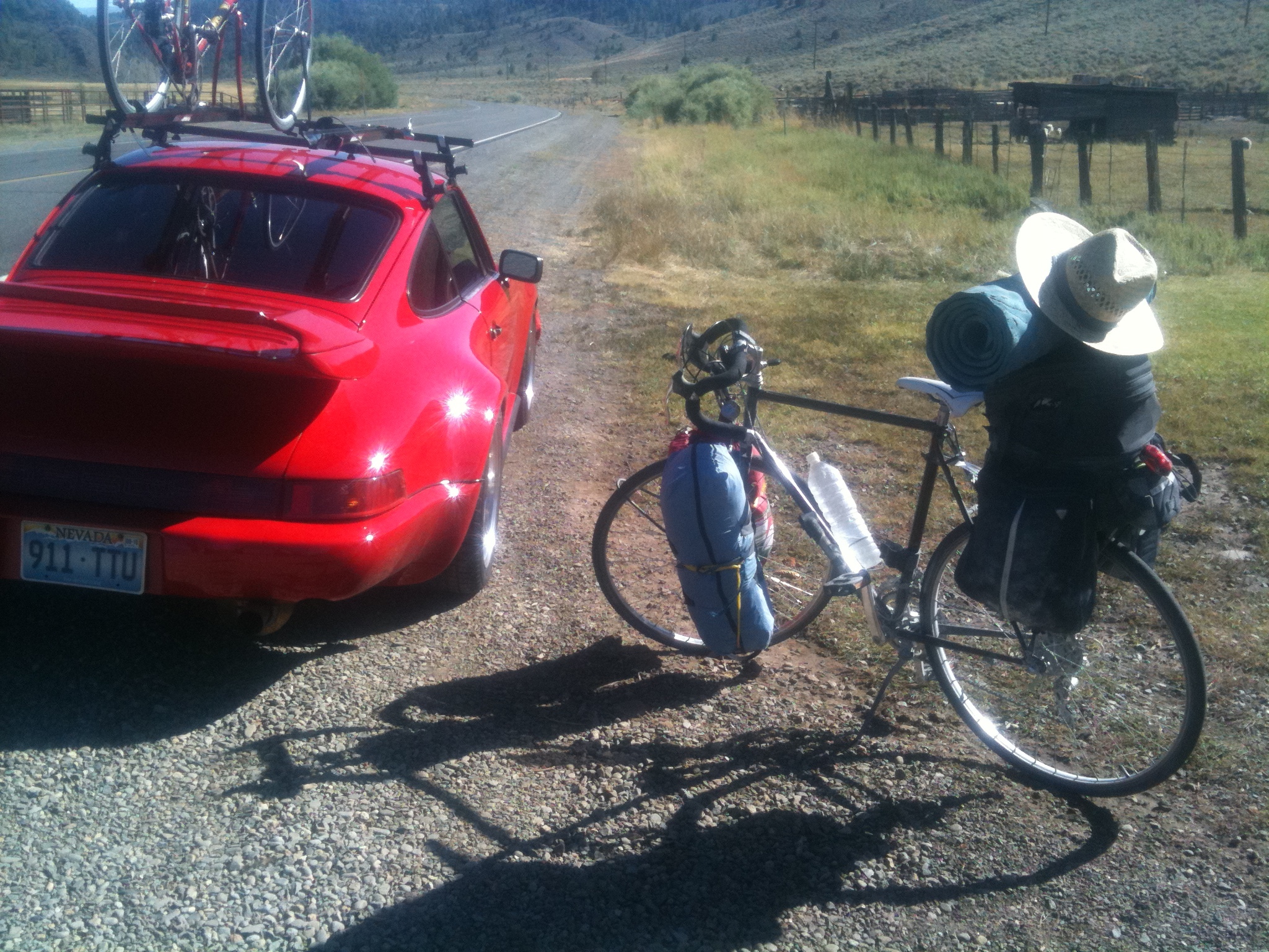 yet risen above the canyon walls, and it was cold, but oh so refreshing. It was so good, that it made me glad that I stopped early last night and hadn't ridden past this in the dark. This awesome canyon made the whole day and even yesterday better. I needed an uplift like this kind of beauty. So I rode on with renewed vigor. Soon I got an email from my friend Dean telling me that he was available to meet me for lunch at his favorite burger joint which was up on the 395 which I would be getting to today. He said he'd leave his place at about 11:00 and it'd take him two hours to get there, so he'd see me there at 1:ish. So I had another goal to shoot for. It was about forty miles away and it was just after 9:30. That seemed doable. But what I didn't realize was that the valley I was in was about 4760 feet, and the rise was slight at 4808 on the other side of the valley, but the climb out of the valley to get to the 395, was intense. The summit was at 5483. a 675 foot climb is no laughing matter. And that it only took me an hour I think is pretty impressive. And I got myself to the junction of the 208 and the 395 at about noon:45. I called Dean to tell him that I would be late to the burger joint as it was still about twenty miles away and the hill I was looking at was not going to be easy. Dean said he was close and I should hang tight and he'd come by and pick me up. Which he did. I was grateful and actually it was probably a good thing, because I was so focused on getting to Walker Burger in time, that I forgot to eat anything but my Clif bars in peanut butter that morning. So I was feeling a but dizzy and headachey. Dean pulled up in a Porsche with a bike rack on top and we took my front tire and front rack off so we could fit it on, but it was worth it for the ride.