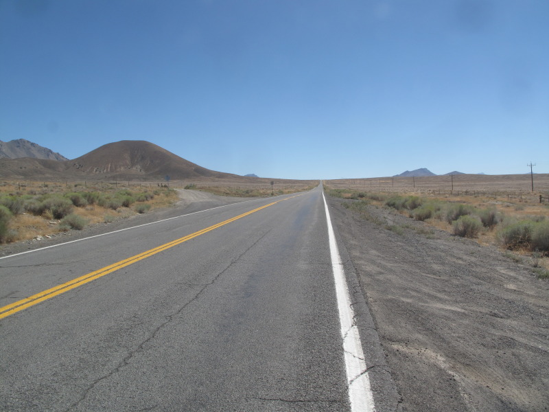So I plugged all of my electronic shit in, and went and used the bathroom and washed up and shaved for the first time in a long time. I went into the gas station and asked if there was a place I could fill my water bottles, and the nice lady working there offered her the sink, but warned me to do it fast so that her boss didn't come out from the back and see me without any shoes on in the store. I did and managed to escape detection. I told her that and she giggled. Both of my batteries were all of the way empty, so the charging would take awhile. I used the time to clean out the trash from my saddle bags. I noticed I had eaten ten Clif bars. I ate two this morning, and I guess four each of the first two days. No wonder I got so sick the first day. Four Clif bars in a day is just not enough. Guh. I talked to her boss a little bit as he came out to clean the bathroom, he was impressed by the scope of what I was trying to do, and wished me luck. When my batteries were full, I asked the lady in the store if there were any good places around for breakfast, she said the Silver Strike had really good breakfast. So off to the Silver Strike I went. And I got a great giant breakfast as only casinos seem to do really well. During my breakfast I got an email from a friend I'd met at Burning Man who lived in Reno, when Dean found out what I was doing he insisted that I let him be my safety net for the Northern leg of my trip. His email said that I had a place to sleep tonight if I wanted it in Smith Valley. He gave me an address, and I looked it up, and it was 60 miles away and I finished breakfast at about noon. I had to get going if I was going to get sixty miles in six hours, although it seemed possible, I felt really good after that breakfast. As I was leaving, I saw a couple come in all decked out in the biker's fetish gimp wear, you know what I mean? All spandex and bright colors and race logos or mountains printed on them or whatever? Well, two of them came in, so I asked about their journey. They said they were going to San Francisco via the 50. That seemed like a pretty serious ride as well. I wished them luck and off I went. To tackle more wind and hills. I didn't know there would be quite so much wind or quite that many hills, but there was plenty of both. But I've bitched a lot about wind and hills already, now for a new subject, highway shoulders. I spent the last week riding on highway shoulders. There is a new invention that is really great for drivers that has been around for the last ten