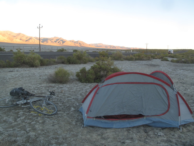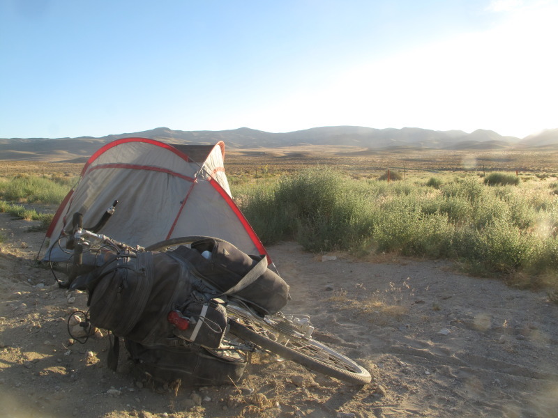 He was so insistent that it took me a long time to get my point across that I prefer not wearing shoes and am unshod on purpose. He finally got it and they drove off. That was uplifting. But it was also 4:15 and I was still quite a ways from where I wanted to be. I guessed I had about 25 miles left. So I decided that I would just ride into the night for the first time to meet my goal. I kept pushing and at about 6:30 the sun disappeared behind the mountains and the wind persisted, and it was really cold, and I was in my cold gear already. And I was probably twelve miles from my destination. But it was so cold and I was so tired that I decided to just fuck it, the next good spot I saw to pull over, I would. I saw a low spot off to the side of the road, and when I investigated, I saw it was an intake for a drain that ran under the highway. I decided that I could dump my bike in the ditch and just pull off my sleeping bag and sleep in the drainage pipe. Which I did. But the wind that forced me to quit was now whipping through the drain, and I couldn't zip up my bag over my head, and I couldn't turn around because I'd be tilted upside down, so I had to abandon the drain idea and actually get out my tent. The other side of the highway was much much lower, so I set up camp over there. The problem was with these terrible little thorny plants that when you touch them, they leave spines like a cactus all over you, so I had to weed a section of earth big enough for what I remember my tent size to be. And in the dark, and with a rock. But I managed. And got everything into my tent that I needed, and spent the night pulling spines out of my fingers until I fell asleep listening to the wind whip my tent around. Day Four